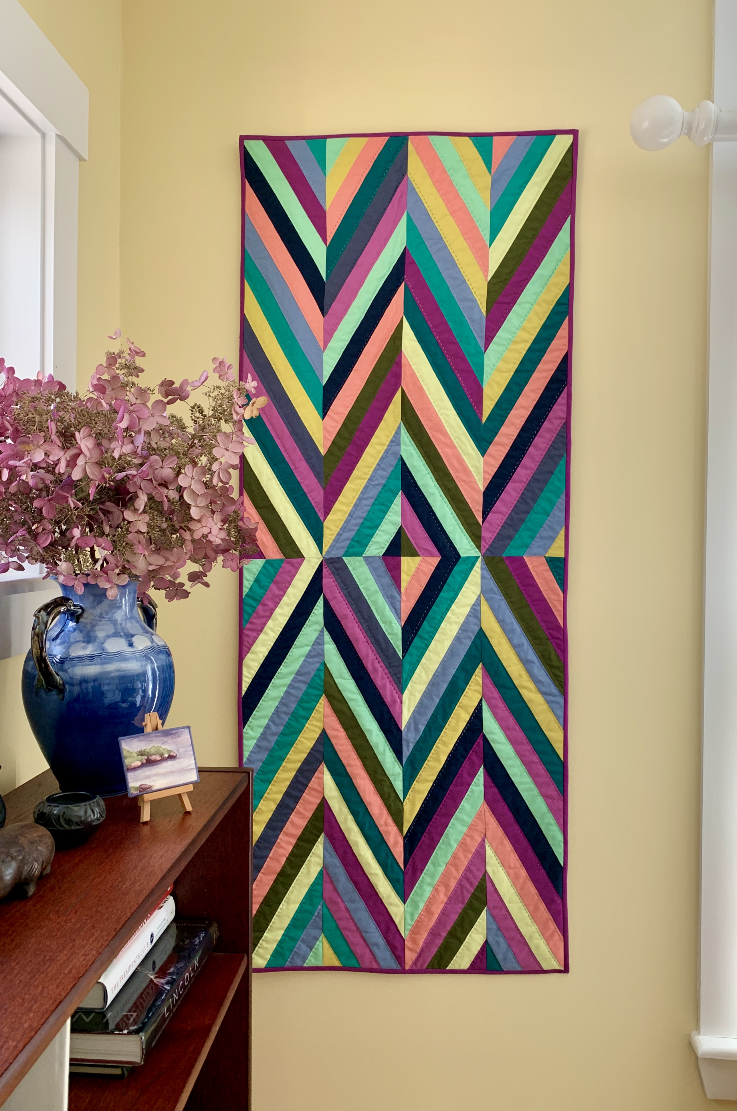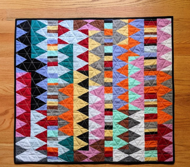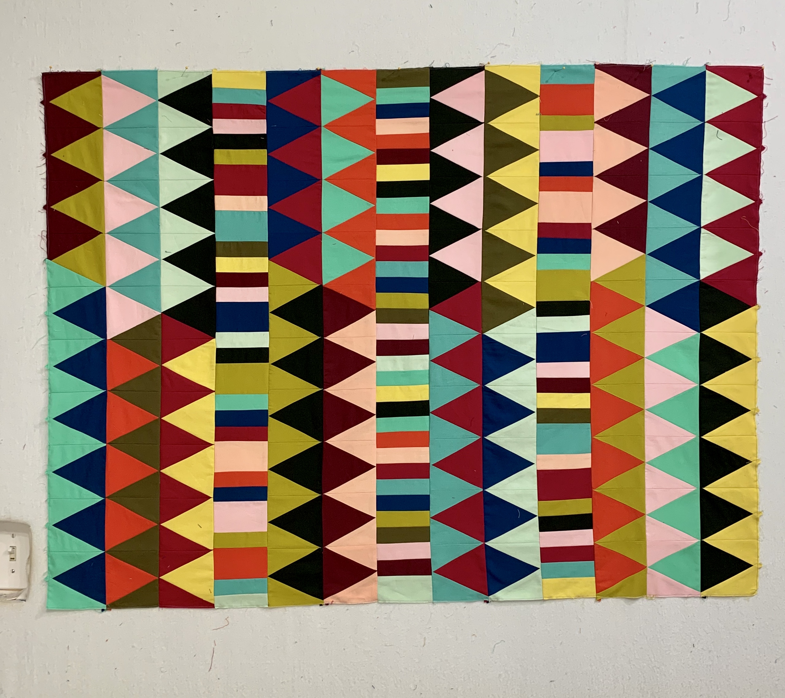 It started with seeing Debbie Jeske’s triangle quilt from a class she took with Alaskan quilter Maria Shell at this past year’s QuiltCon virtual (during covid) 2021 meeting—where Maria Shell also won a major award.