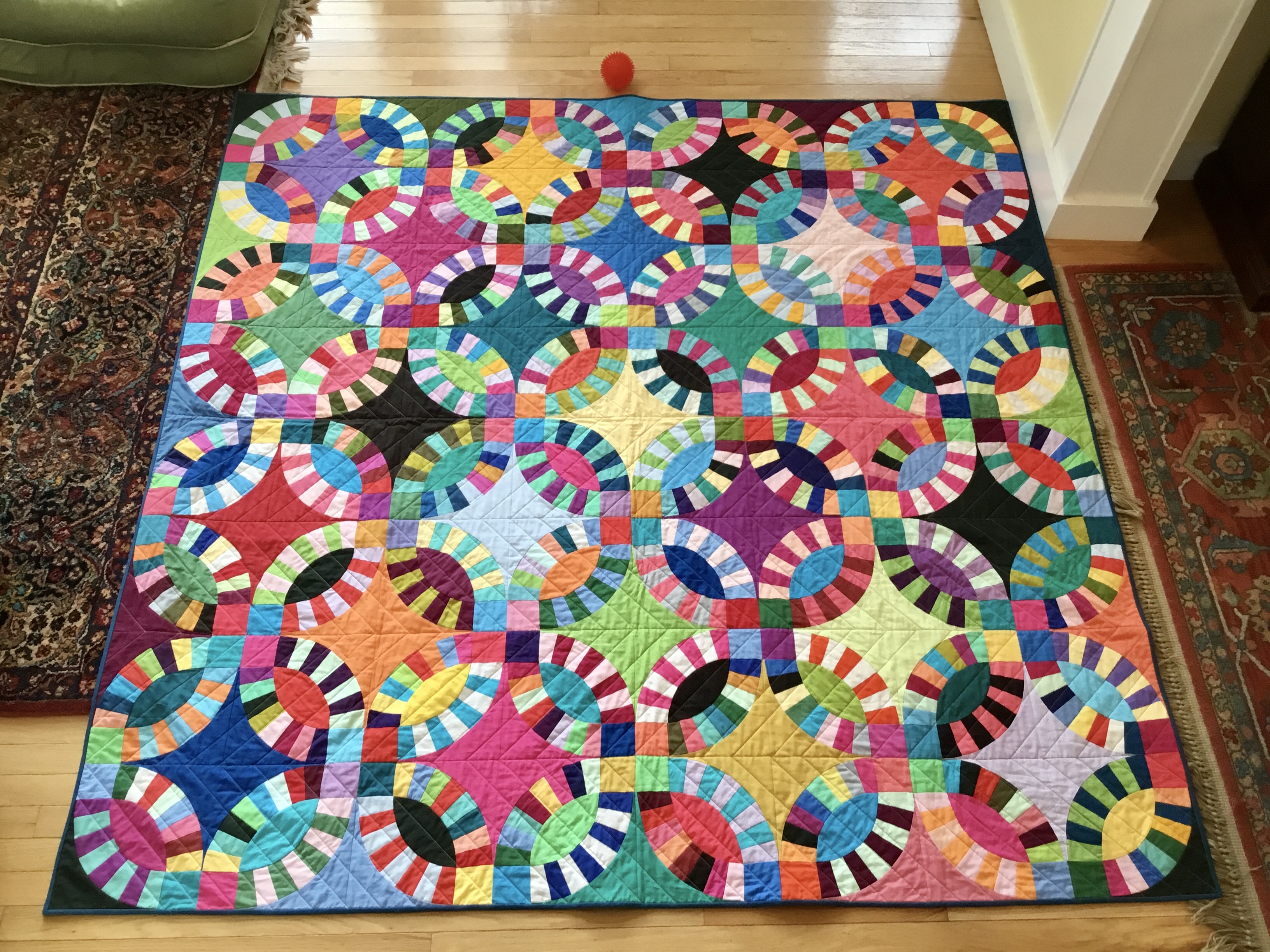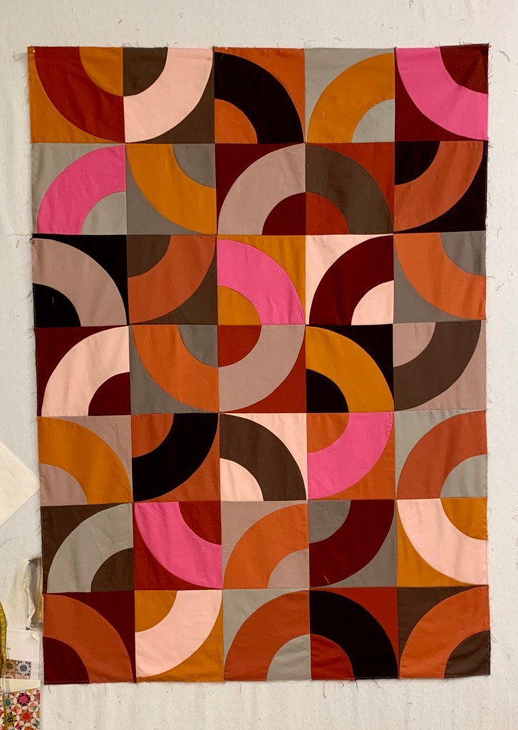 I pushed all the curved blocks together, whereas Latifah Saafir spread them out by including plain fabric blocks—which made for a beautiful, airy quilt. Maybe this could happen along with making blocks with a darker background for a small wall hanging or table runner of some sort.