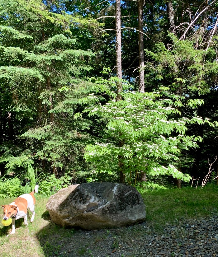 She planted this Kousa dogwood some years back—when facing the garage, it is on the left, just down a very steep hill. I don’t have any dogwoods, nevermind Kousas, so this tree is so fun.