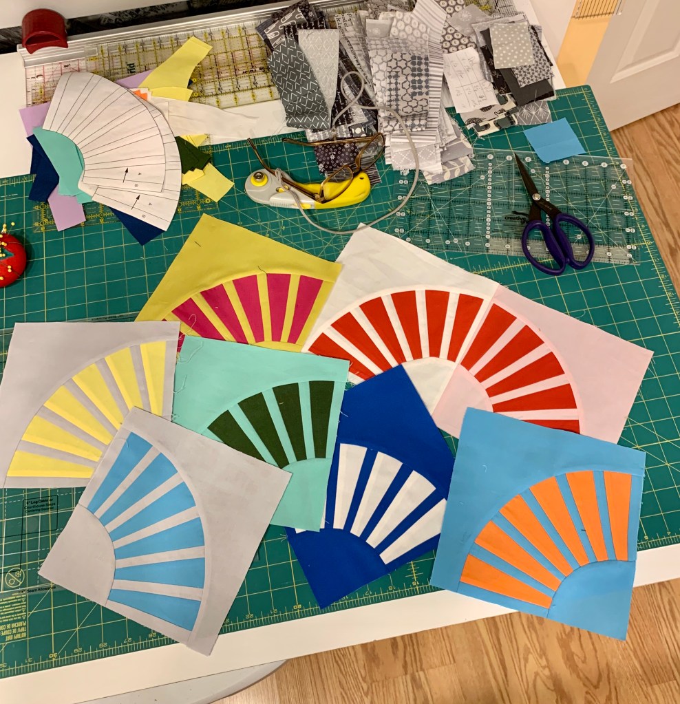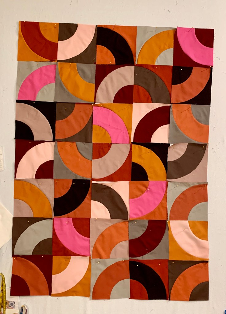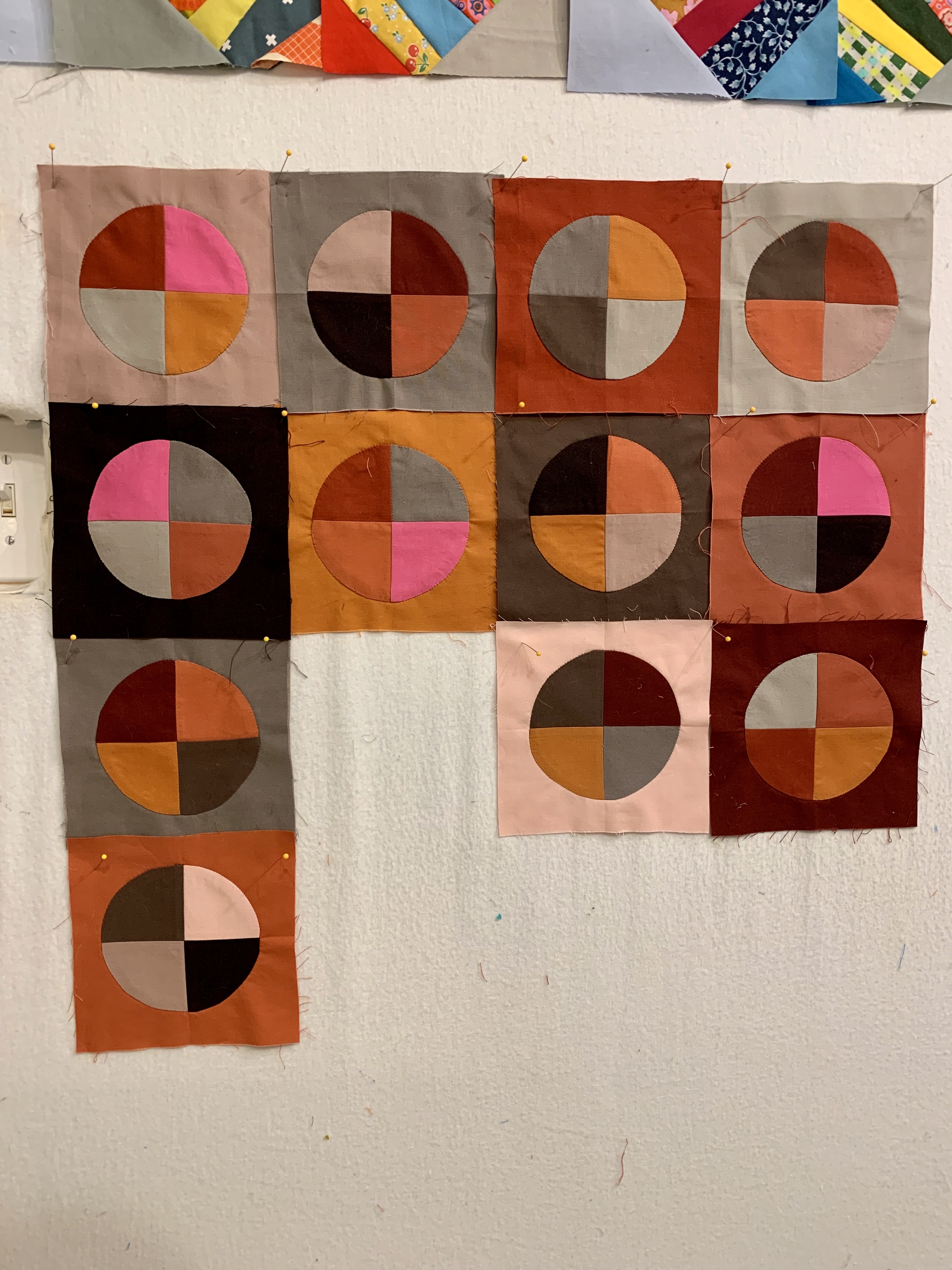 Plus, I am playing around with the discarded quarter circle pieces that arrive when the block pieces are cut. I’ll need to redo this trial one as it got itself off-center while being sewed. And maybe I’ll machine stitch it down with a tiny blanket stitch done in invisible thread—as Tara Faughnan taught us way back in the first project of Season 1. I don’t mind the hand stitching though. I suppose those choices will depend on how many circles are available from the scraps.