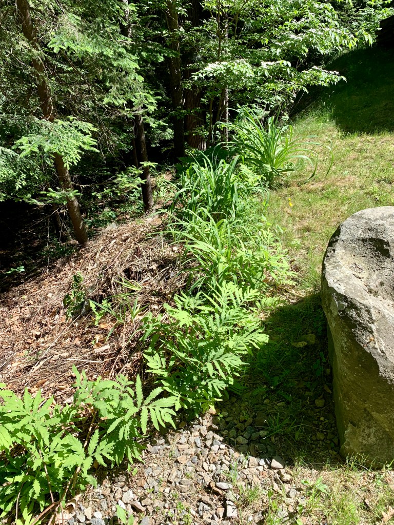 I throw garden refuse along the top edge of that hill, both to stabilize it and to see what might start to grow. It is always amazing to see what begins to grow there. Right now there are some wildflowers, including some orange daylilies, some Joe Pye weed, some Bishop’s Weed, and look what else just emerged in the rocky ground.