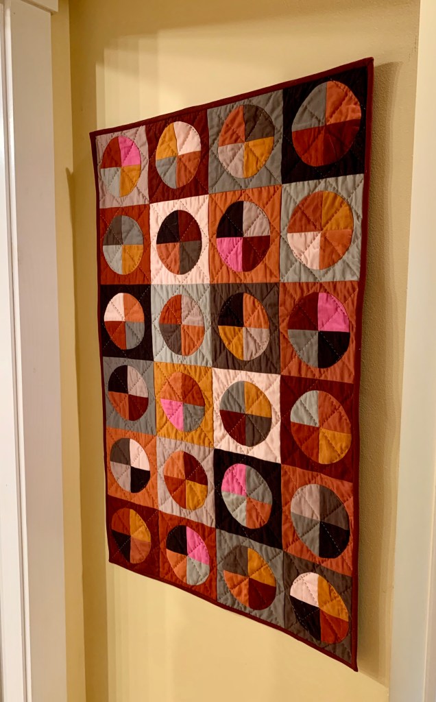 I made this wall hanging from the leftover “Offcut” quarter circle pieces and hung the two quilts opposite each other on the walls outside my quilt room. This one, too, is hand quilted with 12-weight cotton thread (Sulky).
