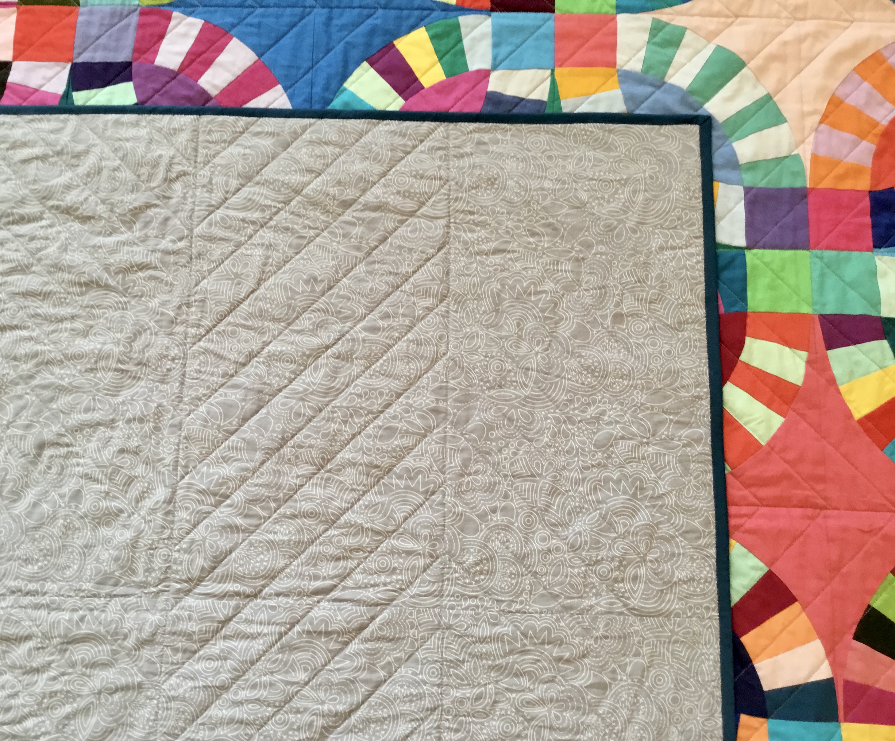 Here are some close-ups. The quilting is not 100% perfect all over the quilt as this ruler was a learning curve. Now that the quilt is bound, washed, and dried, one would not notice the kinds of things I note about the quilting. It’s all good, and I’m happy with the results.