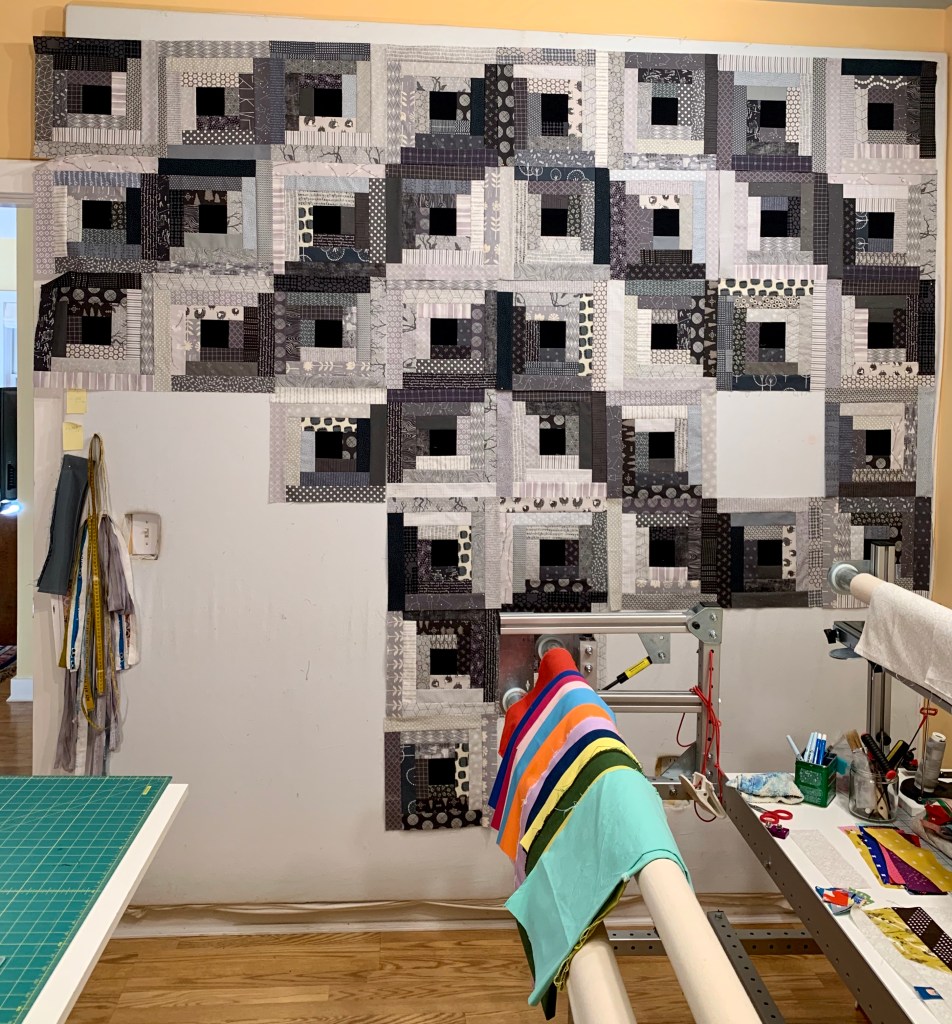 There was time for late afternoon quilting this week. Here’s the log cabin quilt now—it will be 8 rows square, or 96 inches—so I am getting right along with it. I will move around blocks to balance out the more dramatic fabrics before sewing blocks together.