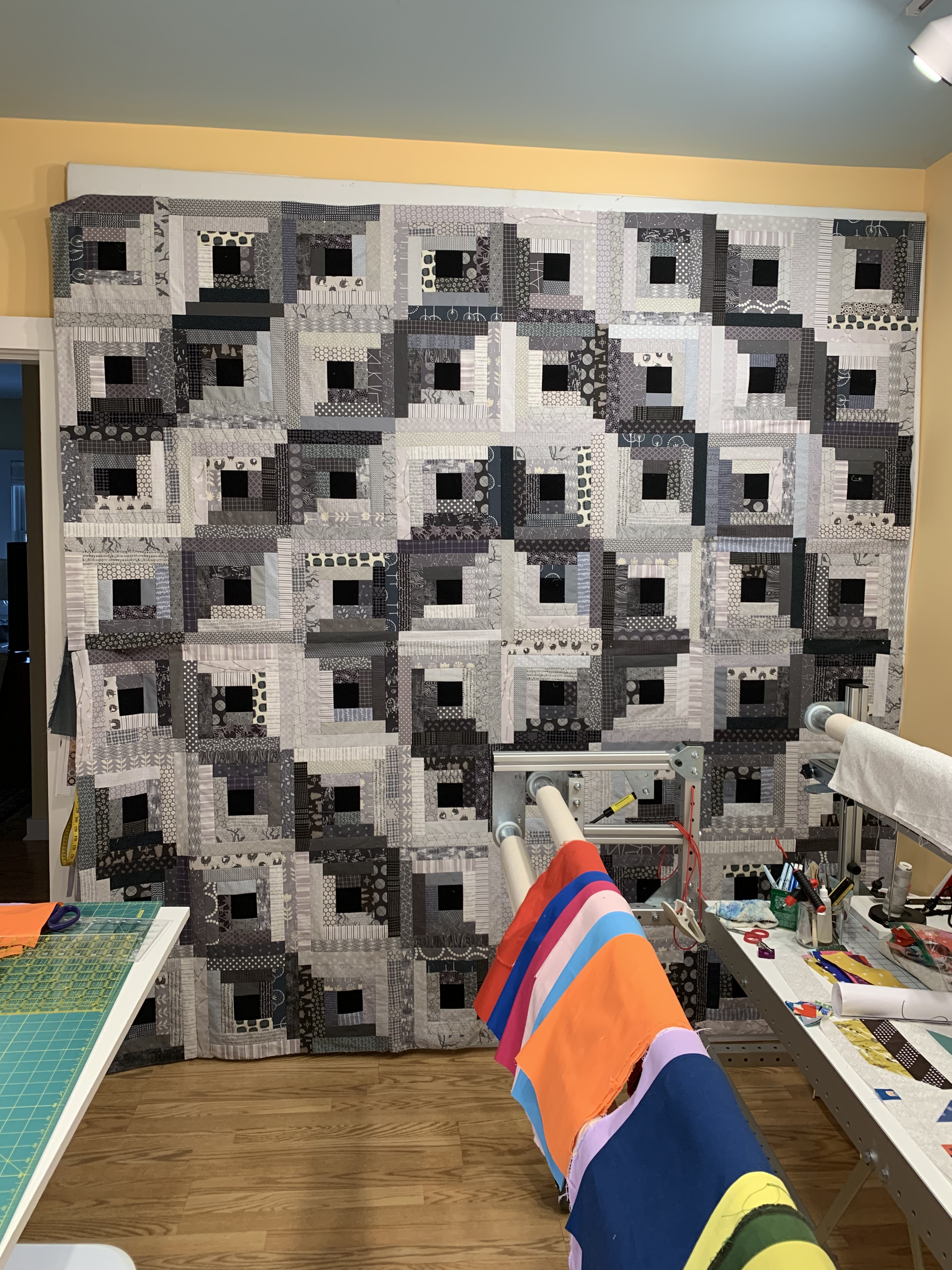 The fabric palette on the longarm bars is from the first project from The Color Collective, season 4–a quilt designer Tara Faughnan is calling ”Sunny.” Resisting making more and more of these blocks is hard—so I’ve limited myself to making two a day and cutting out two more. LOL, I now have 4 cut out and ready to sew. But I need to get the log cabin off the design wall before setting up ”Sunny” there. And that is why my quilting is always endlessly engaging for me.
