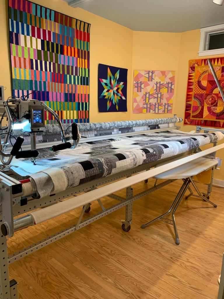 I quilted with a light grey thread by using the 40-inch Innova ruler equipment on the new Innova longarm. There is a basting line crease in this photo that is gone now as I express washed and dried Joyful to remove the basting lines.