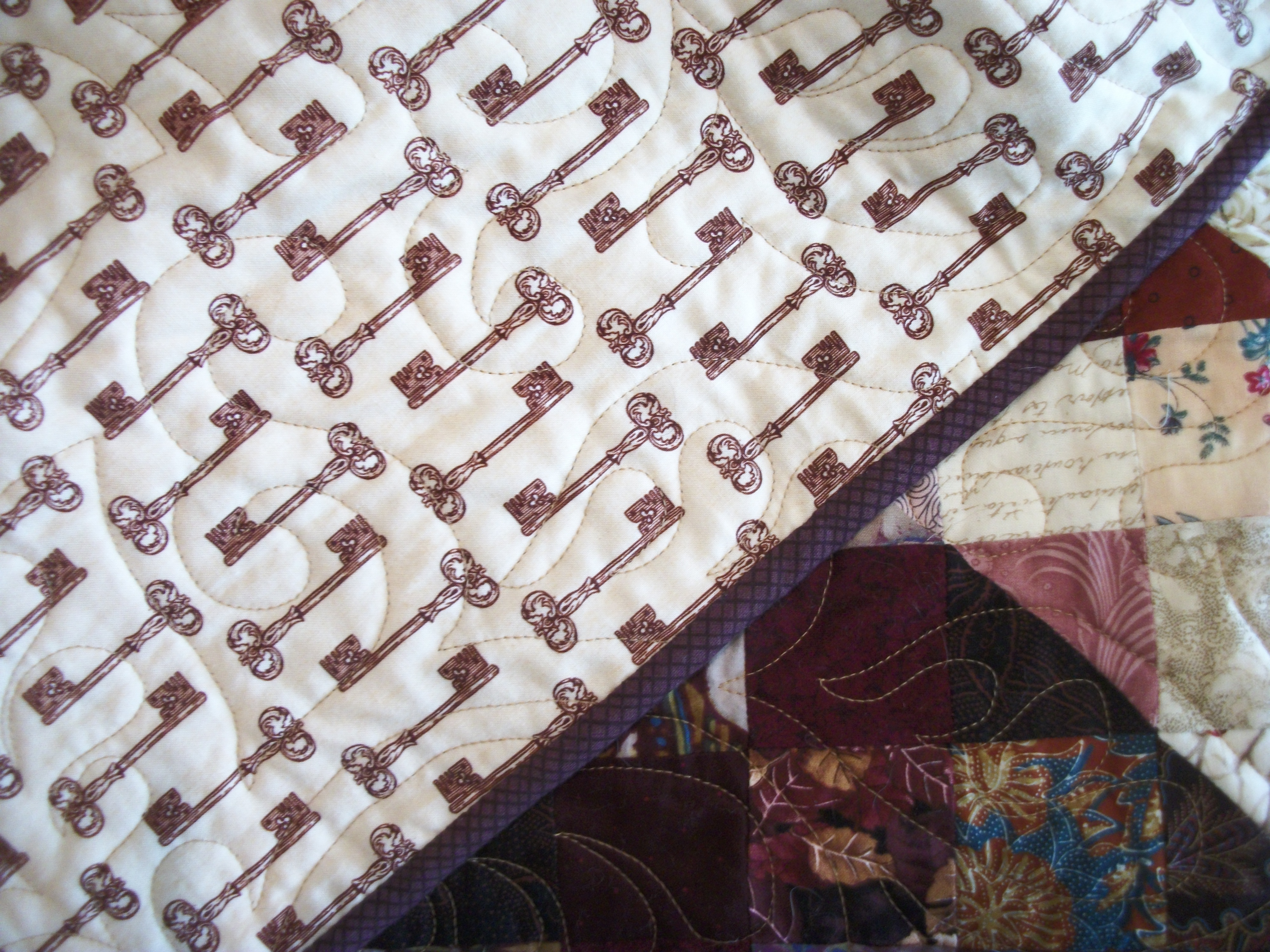 I quilted with a lavender thread, which matched the backing, and it worked beautifully. The pantograph is “Arcadia” from Urban Elements by Patricia E. Ritter.