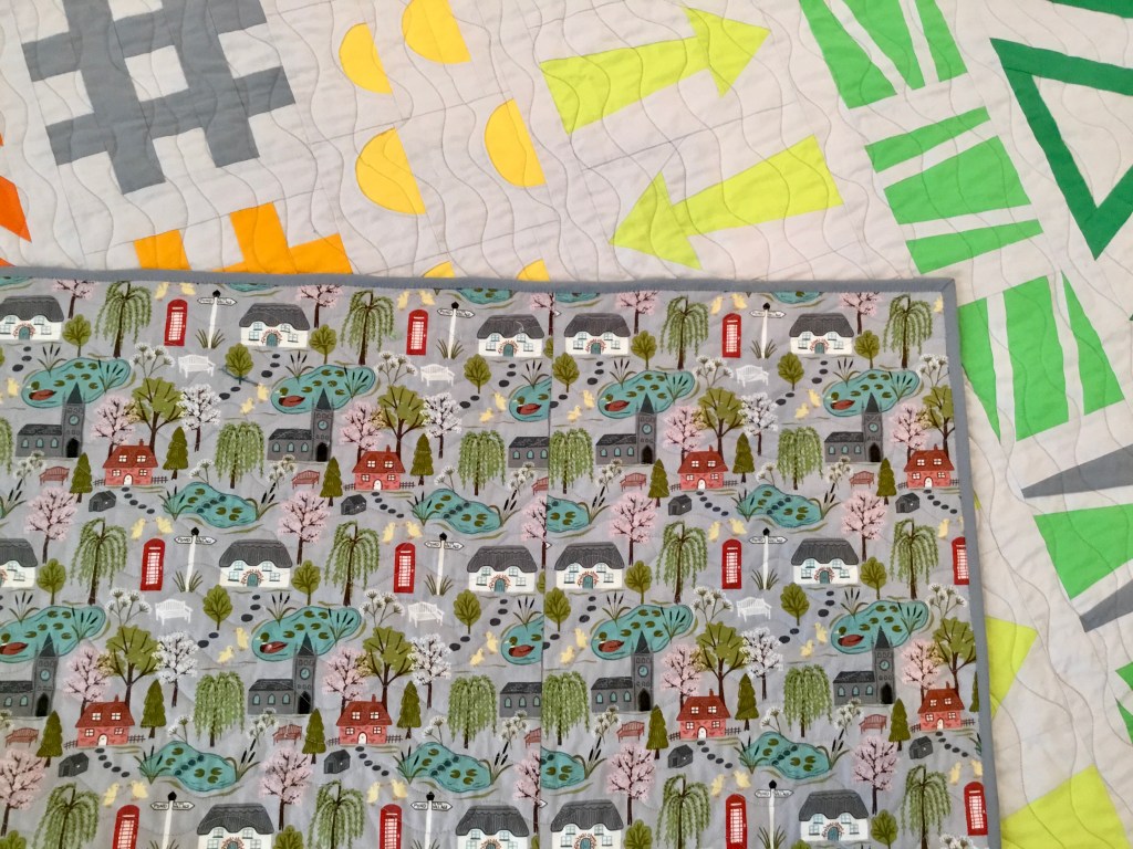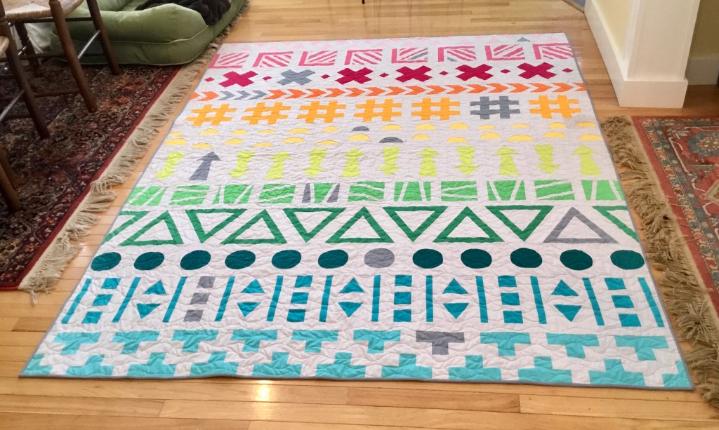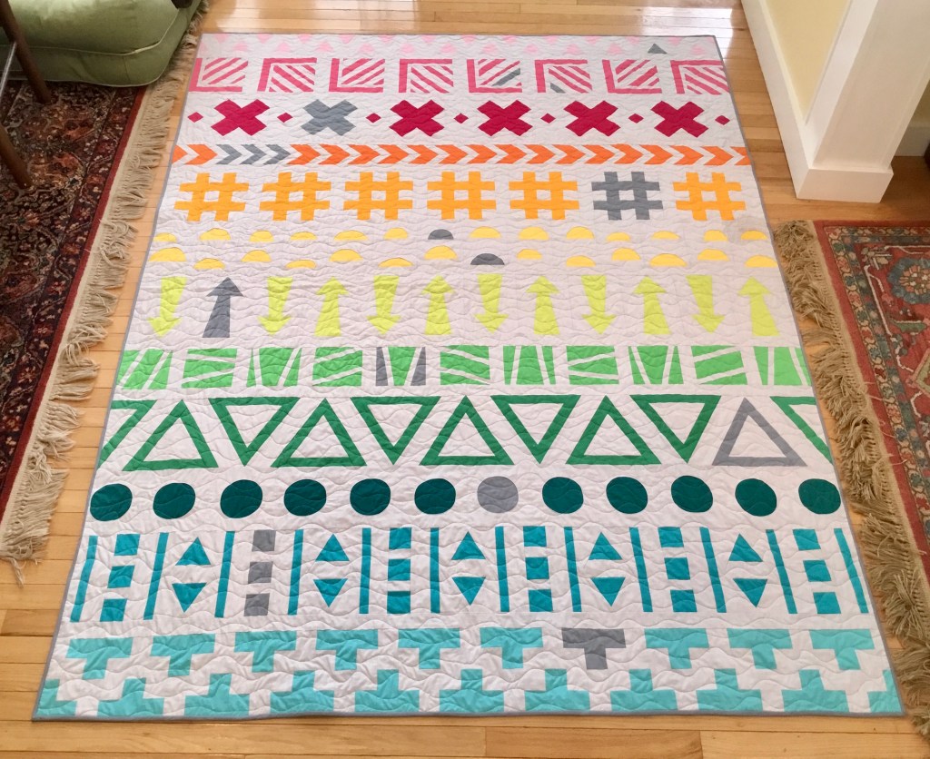 I took a bit of a chance with the wide stripe binding—but I’m really pleased with how it turned out. I cut bindings on the bias, so a bias-cut stripe can work really well with some quilts. There is actually a lot of black in this quilt, so the binding fits right in just right. The first pic below is the bottom, and the second the top.