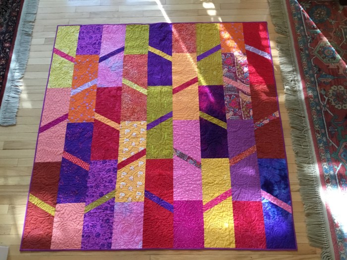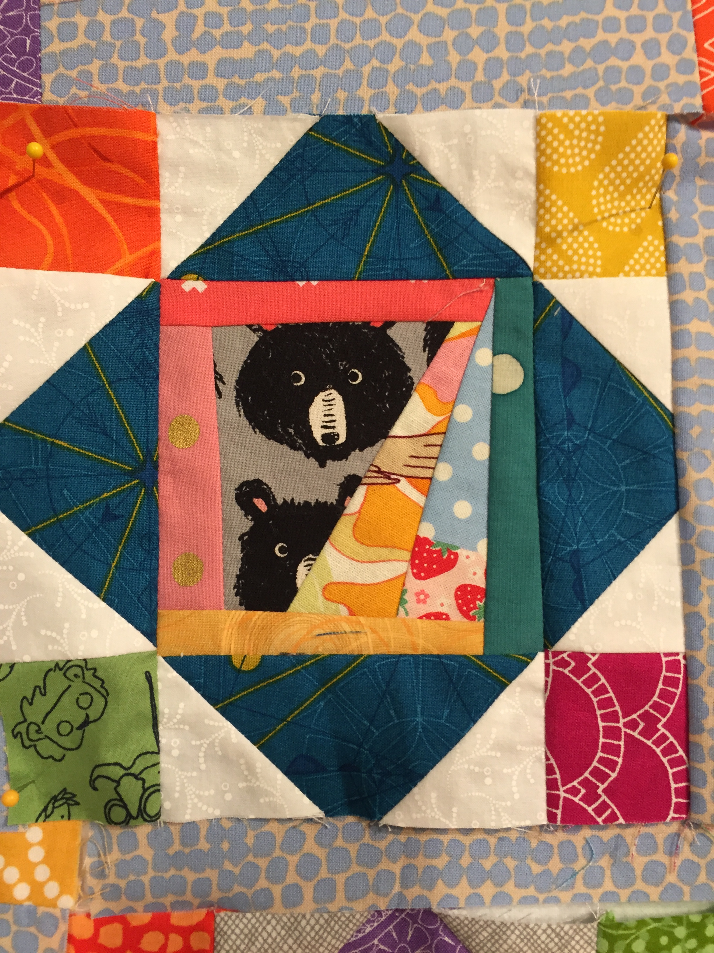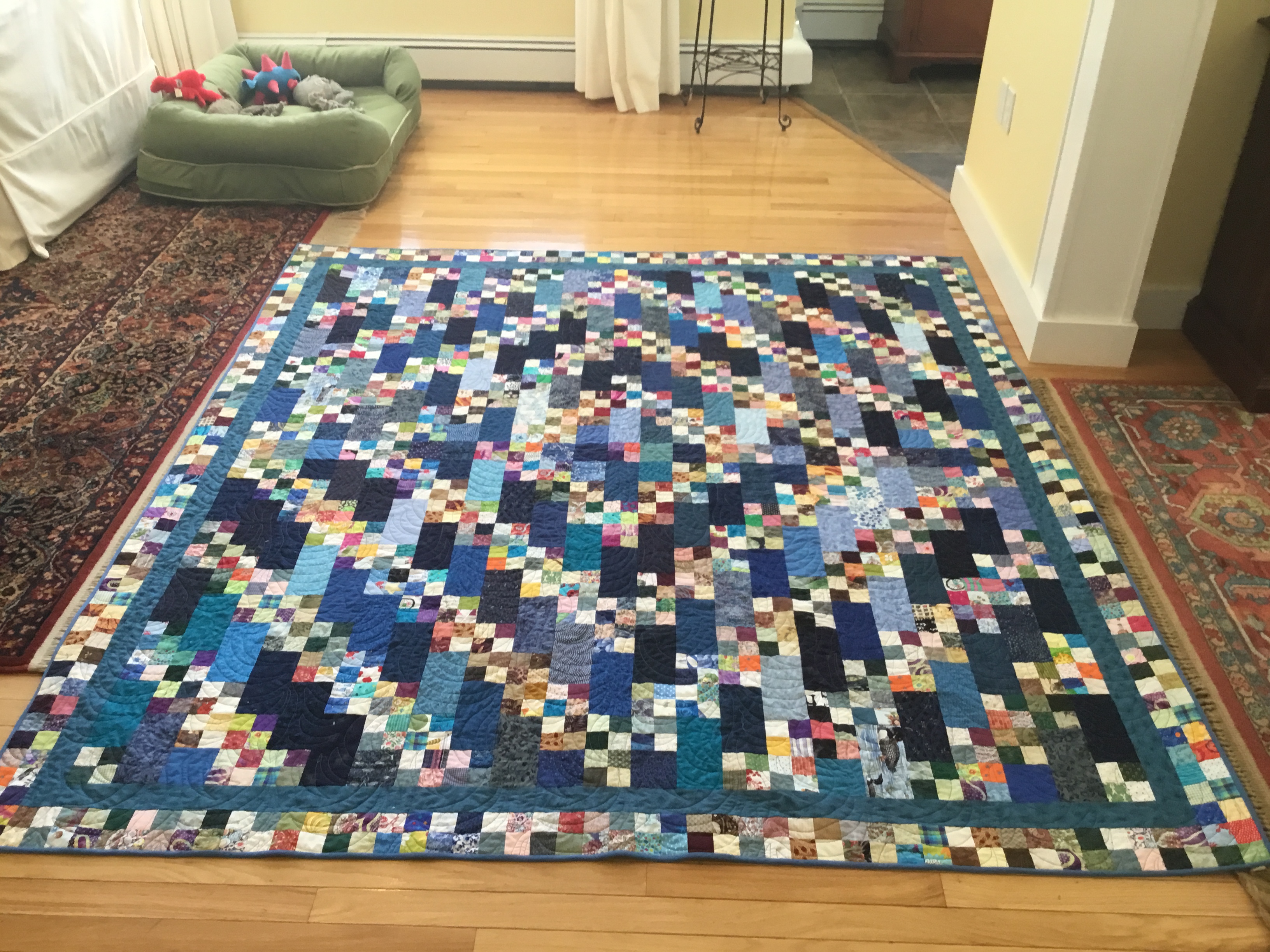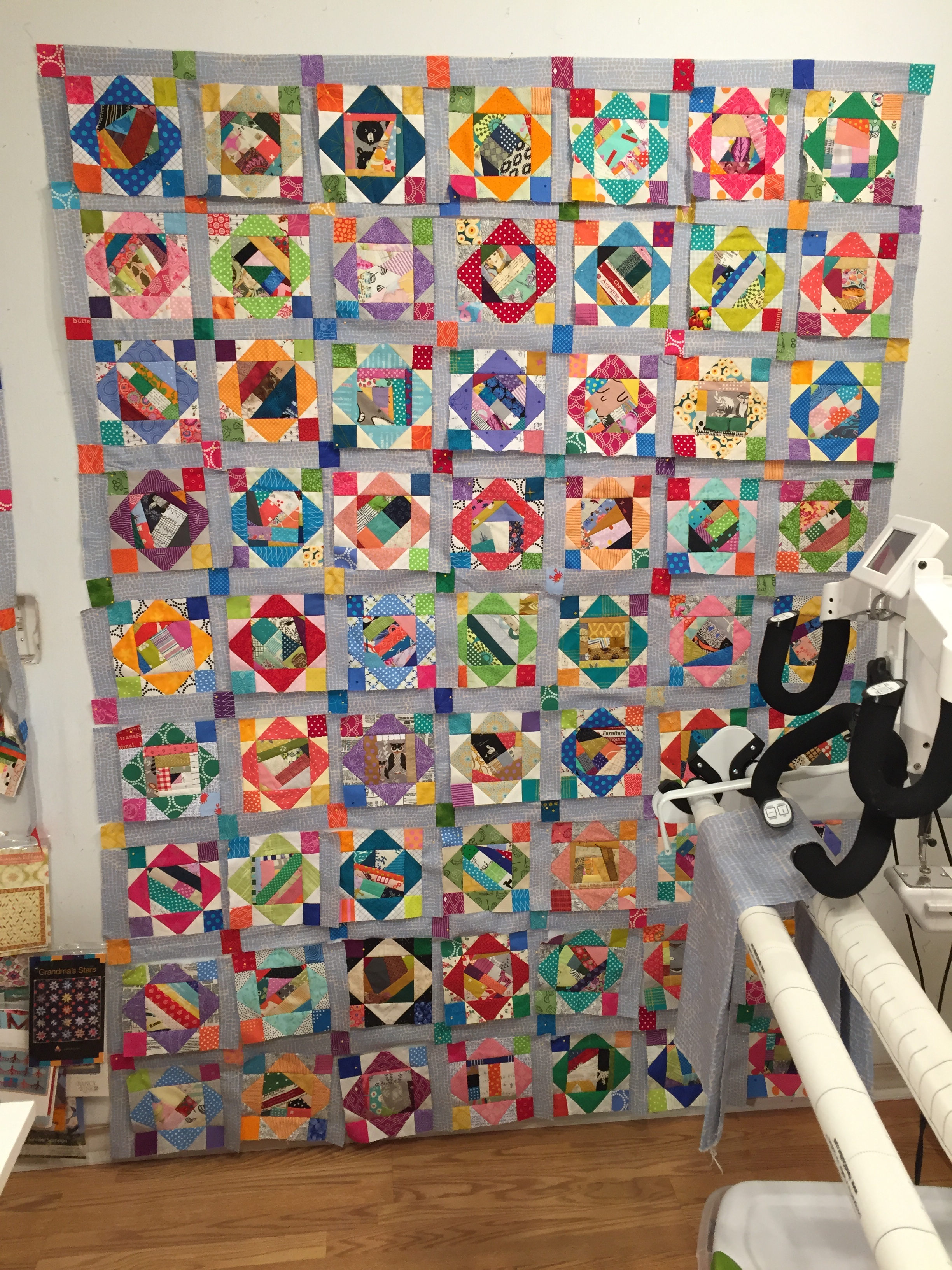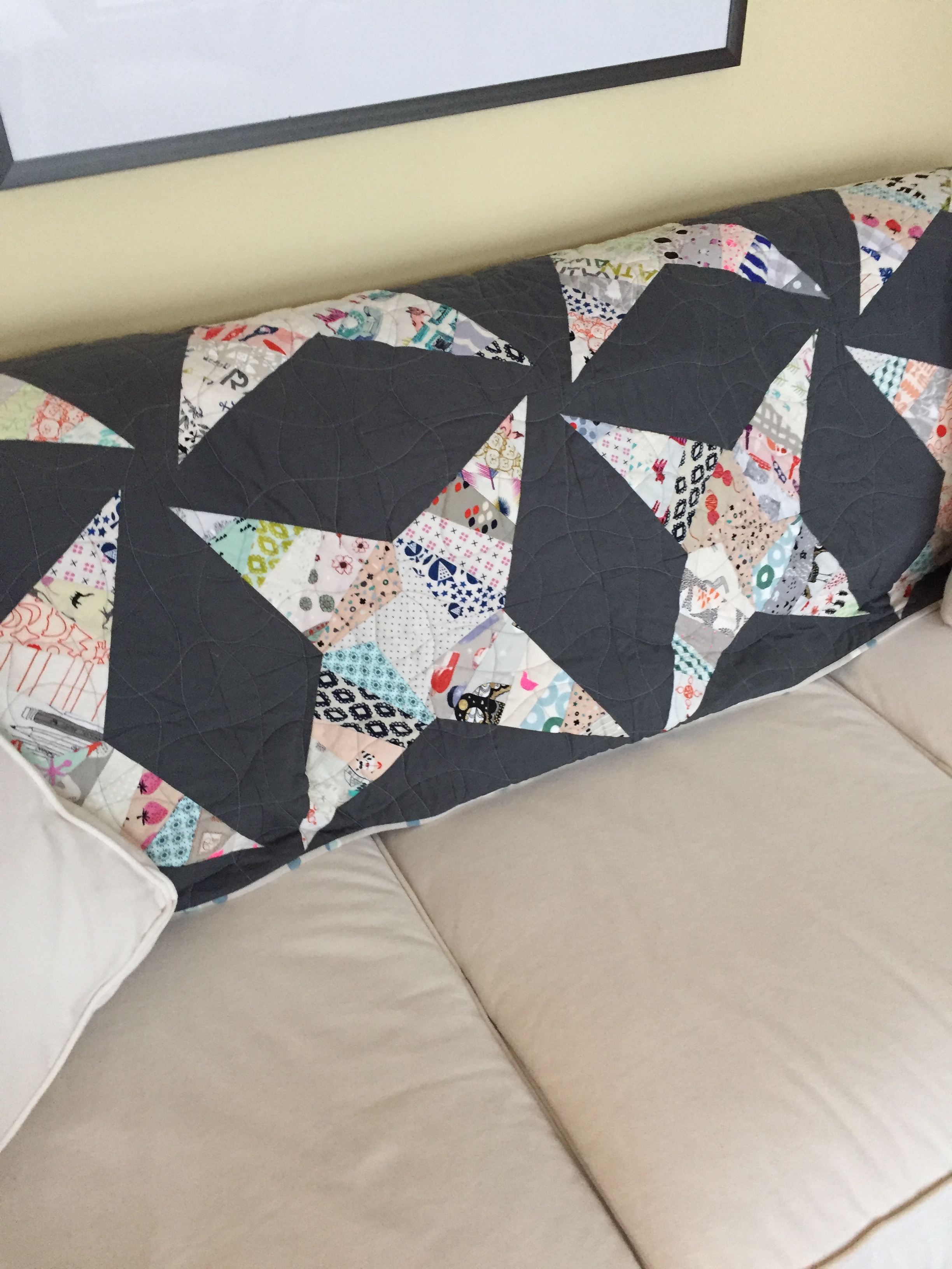 Here’s the backing—again pieced from my stash. I lost the bottom green strip in the quilting. It’s ok.