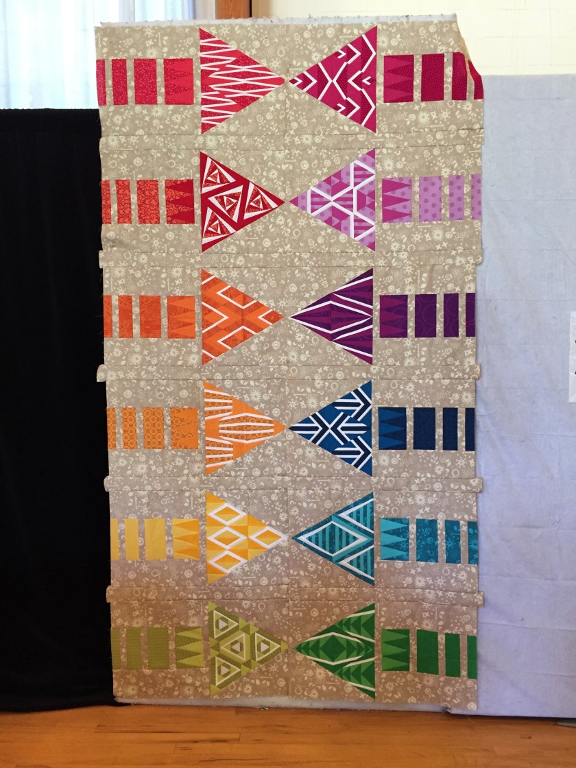 Tori Manzi is a master foundation piecer. She finished the side sections of this quilt on this retreat. There is a big plain section that goes between the arrow points. And see below that the arrow head and some of the stock are elaborately foundation paper pieced.