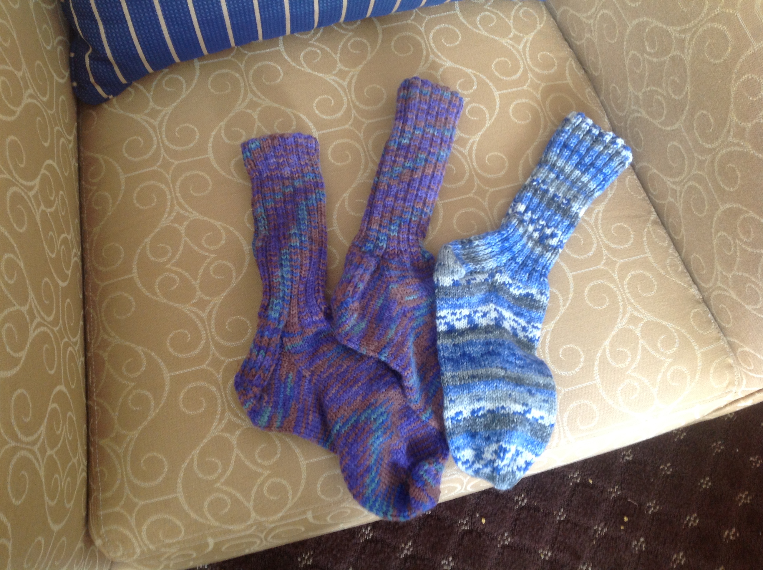 Meanwhile, Caroline had two pairs of socks with toe errors. She had sewn them together going up and down rather than side to side. And we had to rip one back to the point where she decreased to get the toe right. But, here they are–all fixed and, hopefully, being worn now: