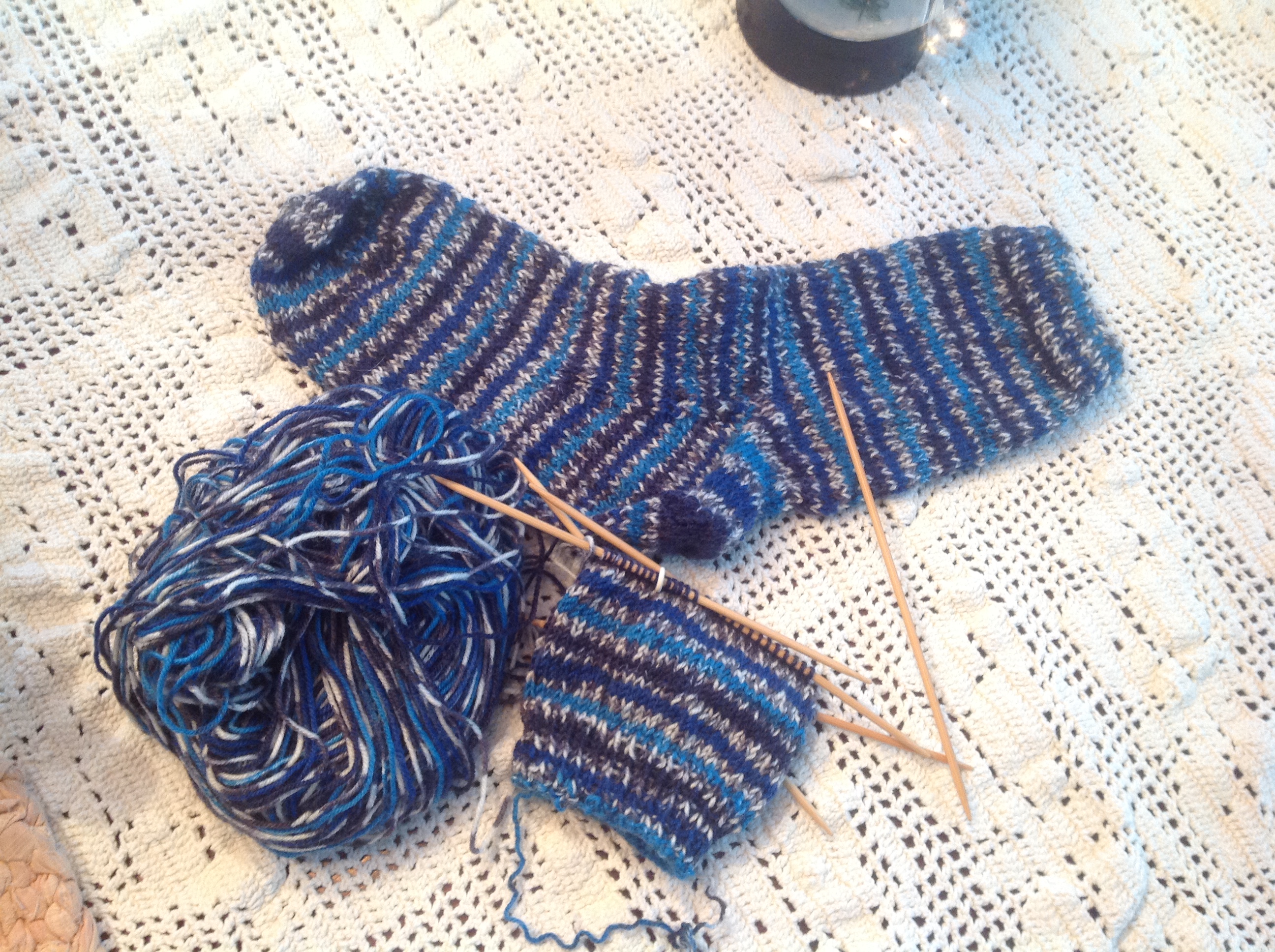 I had probably been making the first socks I was learning to make the previous year. I was using bigger needles, size 3, Lion Brand sock yarn, and their free pattern–which makes a heavy sock best for boots. (I now use size 1’s, and the sock is finer.)