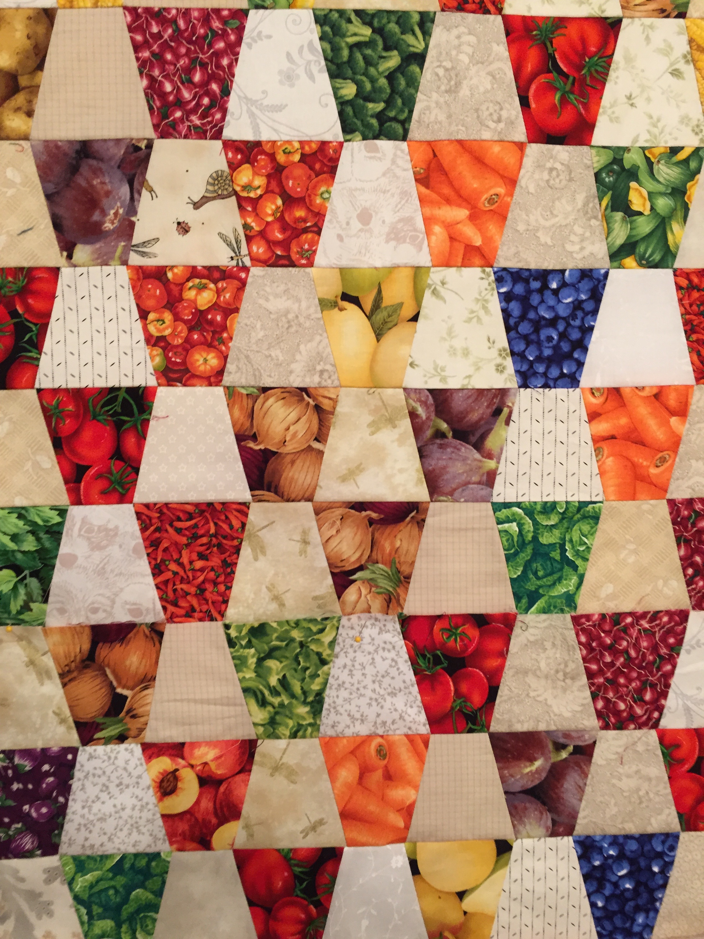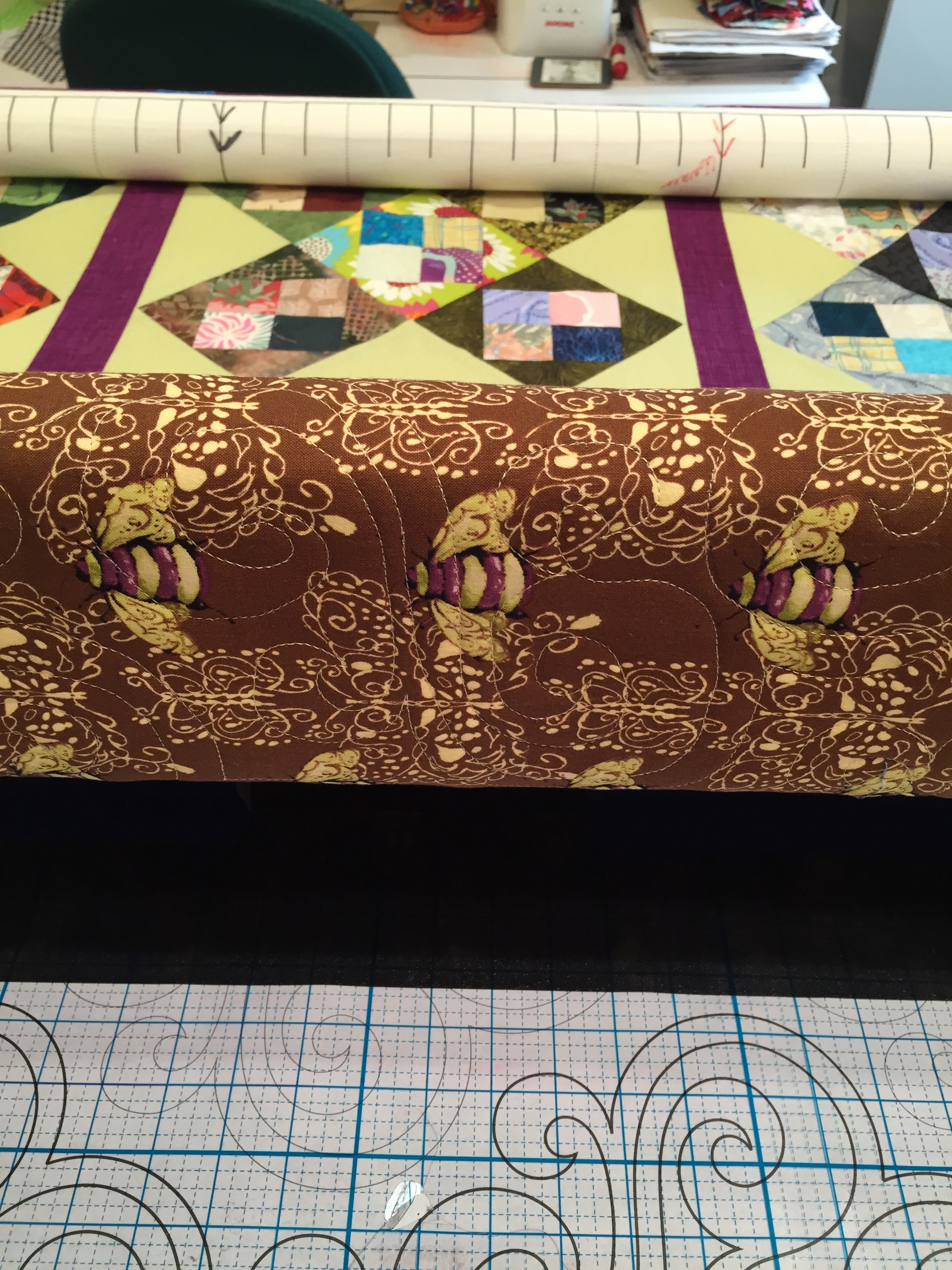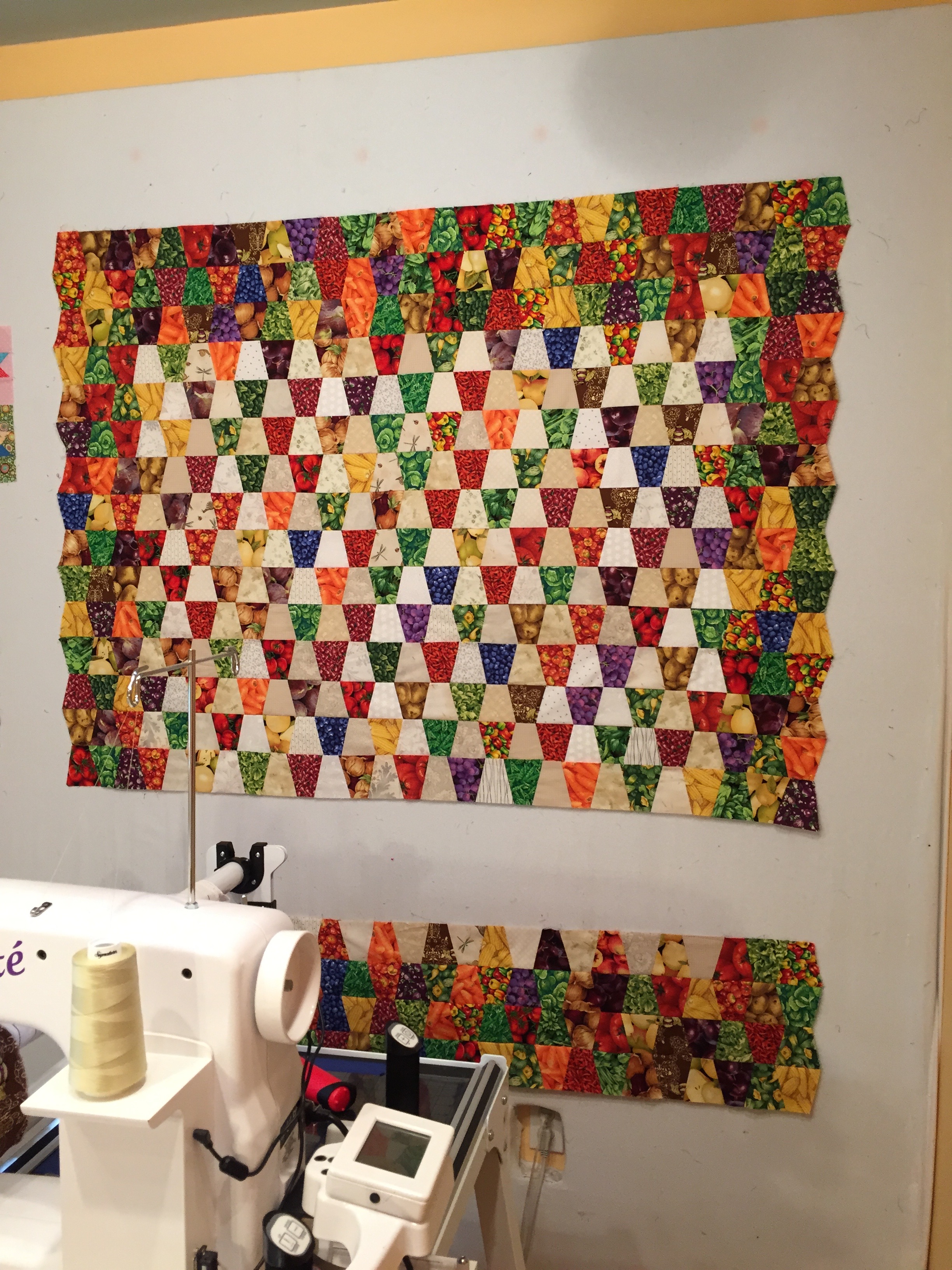 I did the top/right border, the word “joy,” and the little churn dash blocks over the word joy. I also sewed the bottom third of top together, connecting remaining blocks to the top 2/3, and that arrangement remained as I came near the end of the “traveling.”