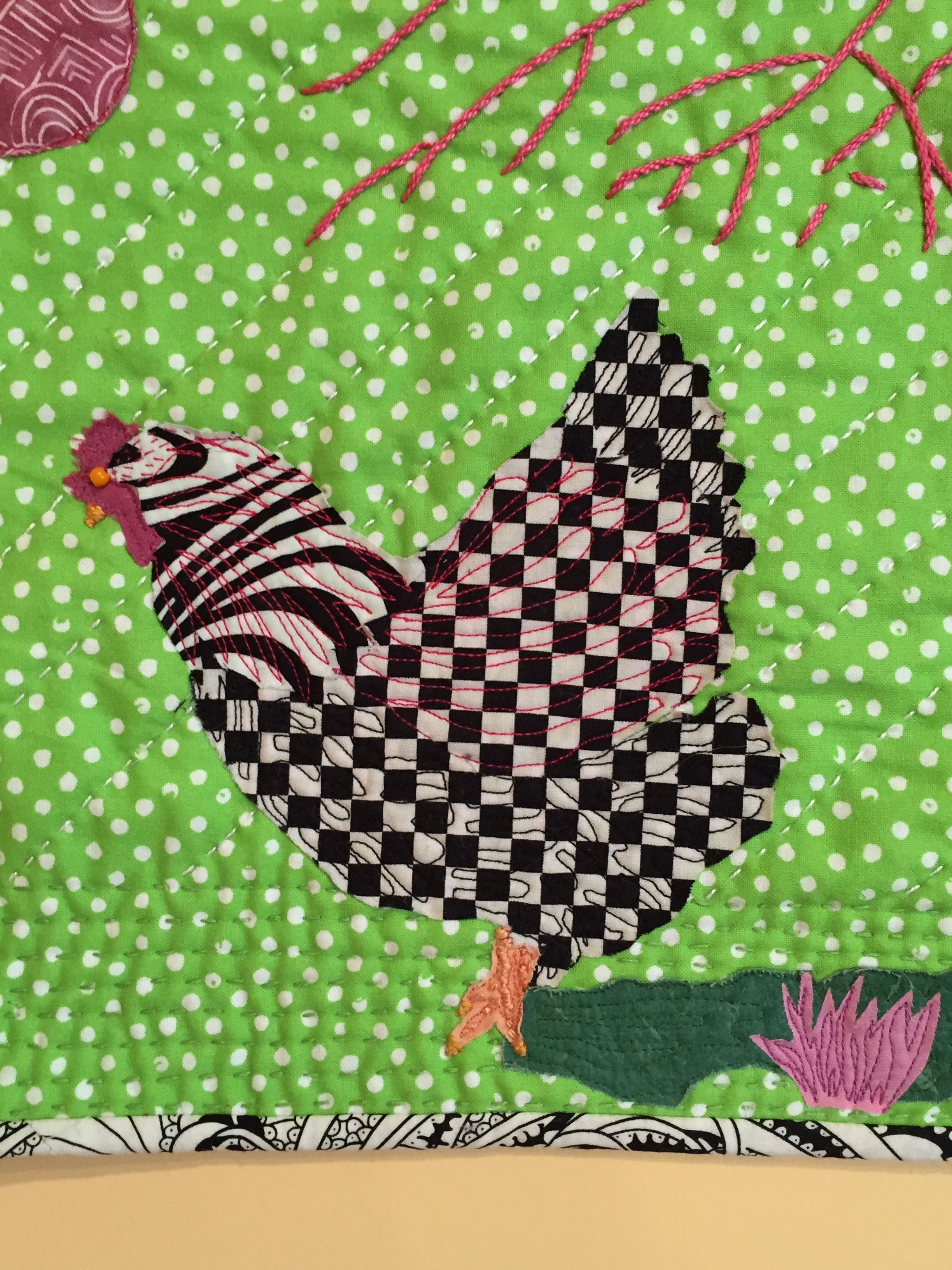 Here is Becca Babb-Brott’s traveling quilt, though I could not get the bottom due to the tables being set up. Becca’s “saying” was “The more I wonder, the more I love.” I think that came from THE COLOR PURPLE novel. Becca did the words—as we all did—so we “travelers” worked in lots of motifs, etc. I did some stars, the fabrics under the first “the,” some flying geese (on the left), and near the “I” at the bottom, the girl figure—which copied that motif from a quilt Becca made some years back.