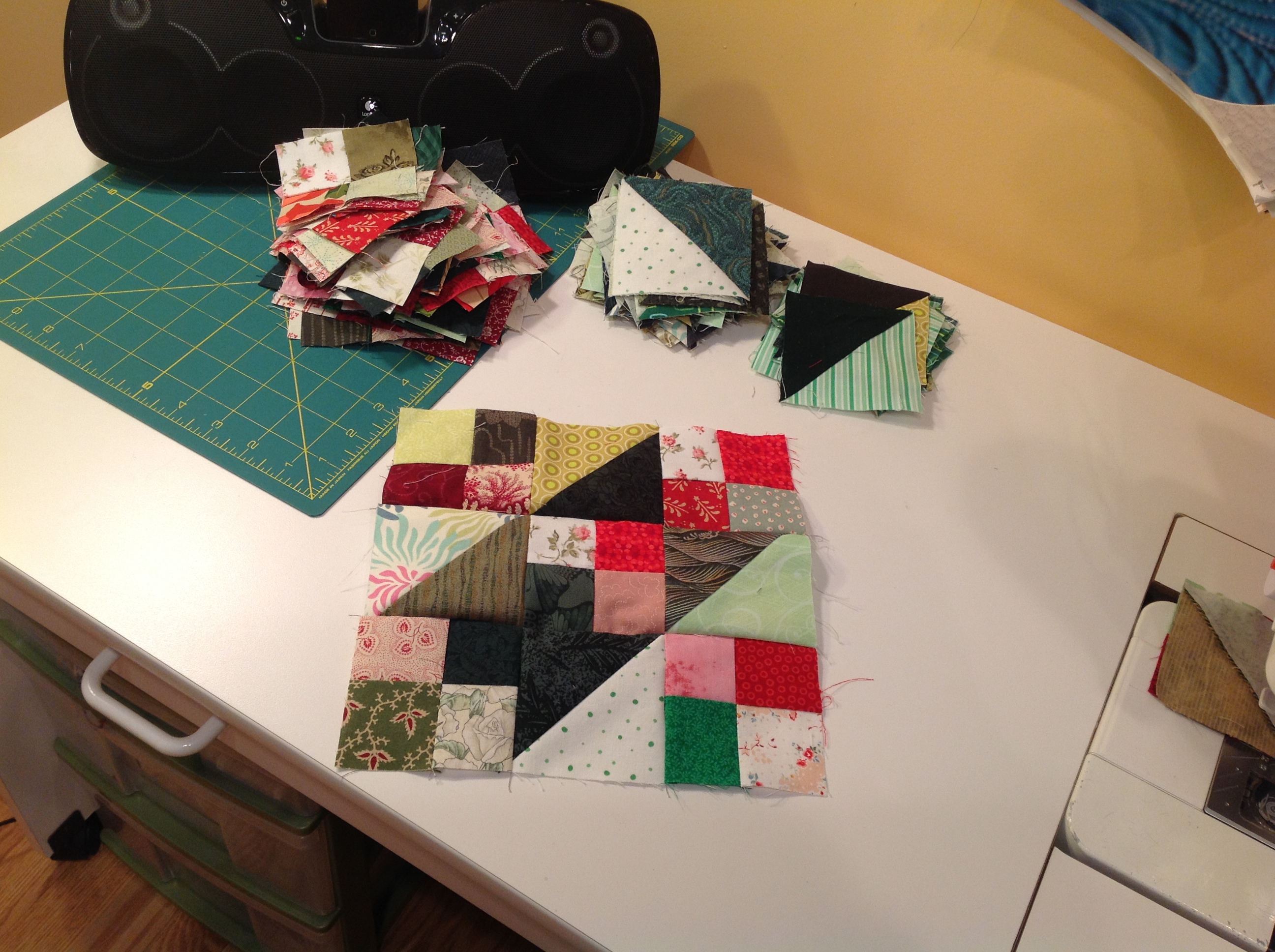 “Acadia” started as a leader/ender project–pioneered by Bonnie Hunter who now has TWO books of her own leader/ender projects. (Basically, you keep a pile of blocks near your machine while working on another quilt, and when you need to cut the thread on the primary quilt, you run through a “leader/ender” block instead.)