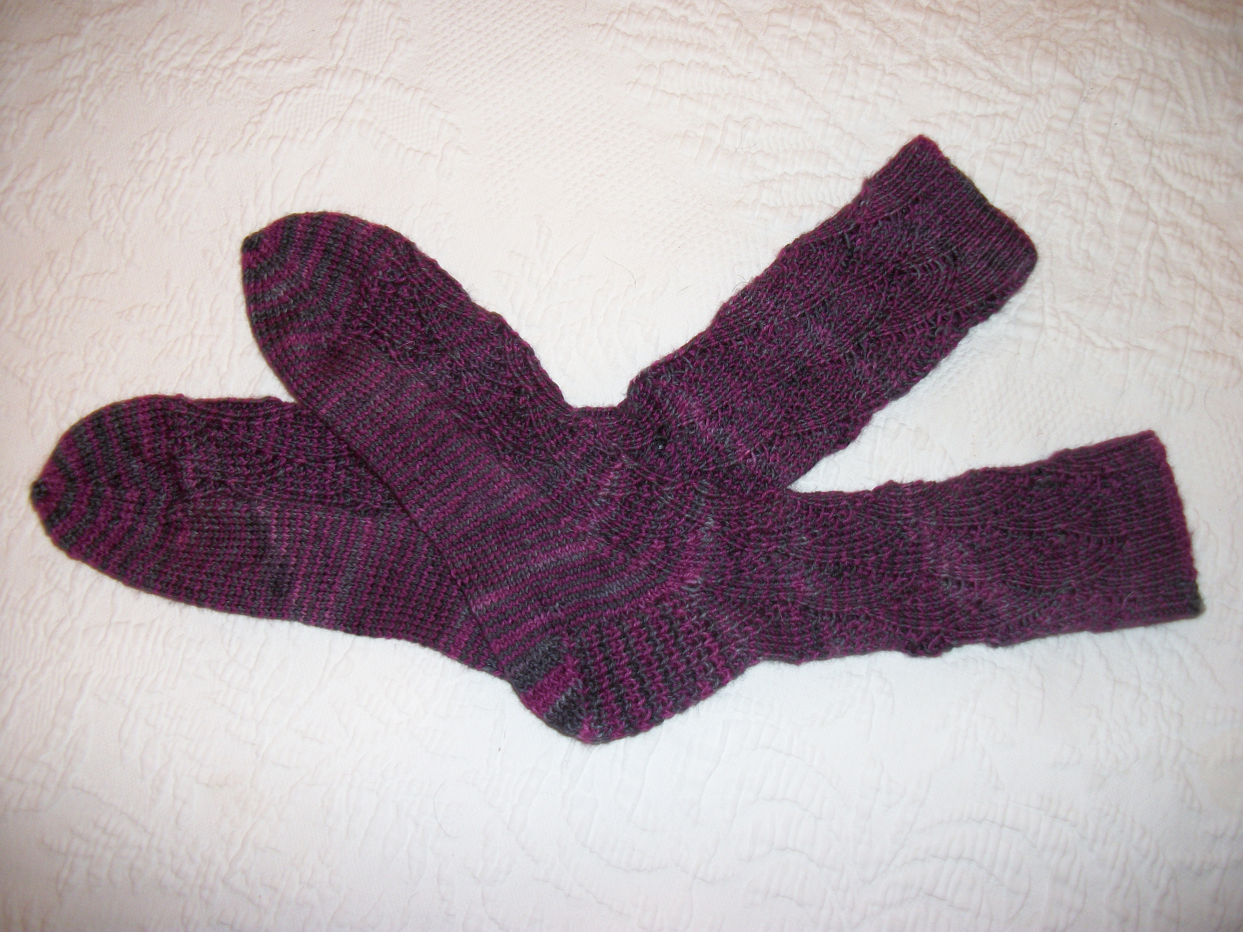 Jane mentioned Cookie A’s work, and I went searching for examples. I just completed Cookie A’s FAMOUS SOCKS–the very first pattern she put on knitty.com and which thousands of people have made now. I’ve also bought BOTH her books, and I can’t wait to start another pair of her socks. Only, most of my current yarn is variegated in nature, and Cookie A’s socks are spectacular in solid yards. I’ll do what I can…