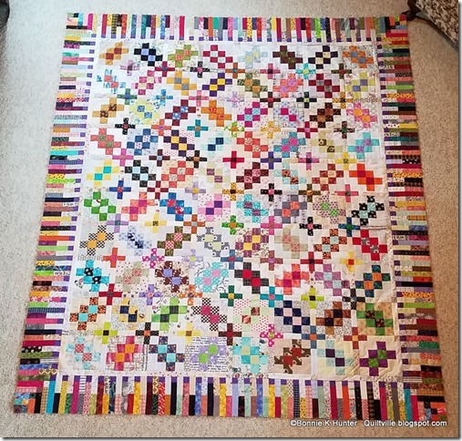 The funky rail fence block is super fun to make. I used a suite of fabrics I’ve never used—and added fabrics from my stash. I pieced the back with the remnants, so that’s a lot of fabrics out of the stash. And does it count as an almost-created Unfinished project since I did have a suite of fabrics kept together? I think so. I do NOT want to be one of those people who dies and leaves a huge amount of fabric for my family to manage.
