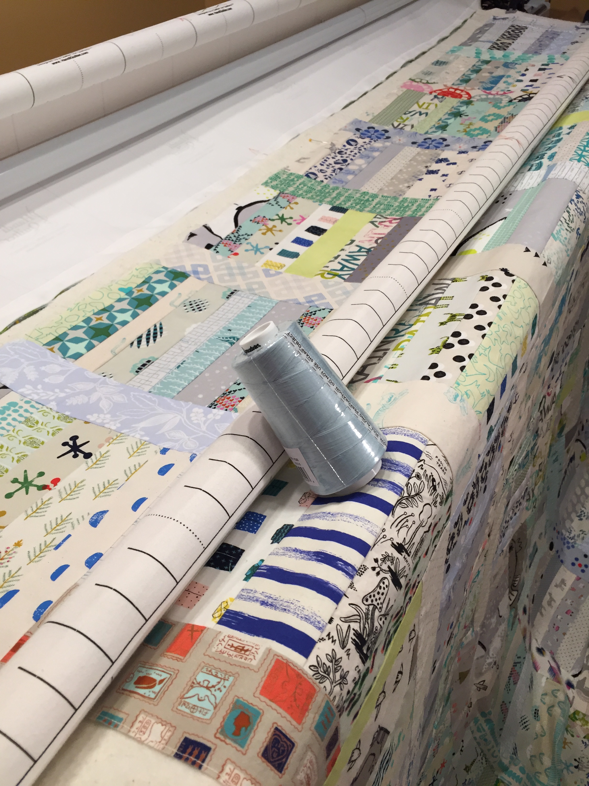 “Trees” is on the longarm—mostly because I need another night time hand-sewing project. Though, I should confess, I can fall back on the EPP project that has been underway for several years now. But, it is a hard project. Sewing binding is more soothing.