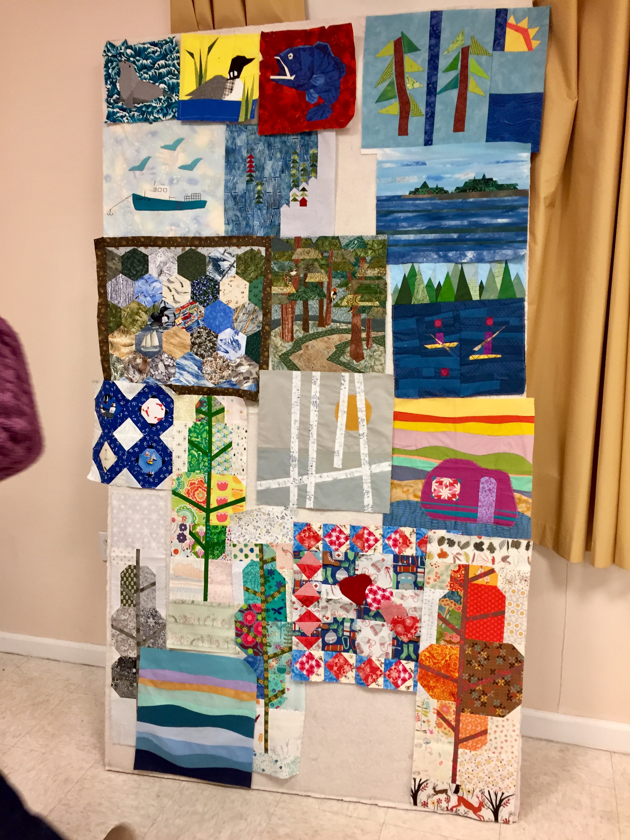 Here are the FIRST blocks for the Mt Battie Modern Quilt Guild’s challenge “Bee Inspired.”  These blocks were made for Donna Strawser, whose prompt was “Mid-Coast Maine.”  You can see the individual blocks better on the Mt. Battie Facebook page or on Instagram.  Thirteen quilters each made one of these blocks for Donna, and she made one for herself, so 14 blocks.  Mine is the white winter birch trees at dawn.  Tori Manzi made the four trees at the bottom, by season.  They really need to be seen lined up together, a you can on FB or IG.  Donna will now set these blocks into a quilt and will bring it back to show us at some point.  I will need to make a block for our next Bee Inspired event in April:  “Dark and Light” for Vicki Fletcher.