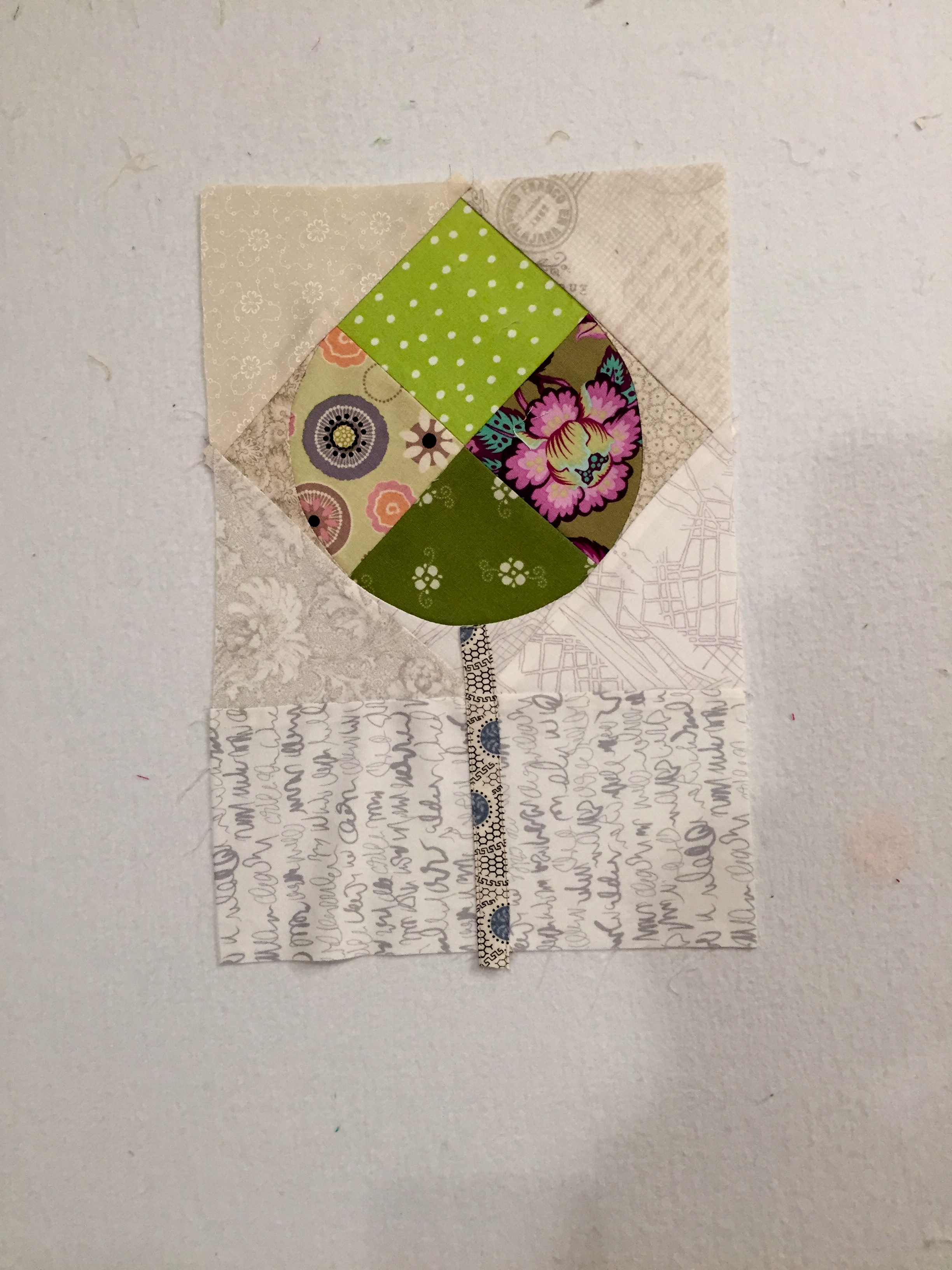 I pulled out some old blocks–because I wanted to see how the very modern fabric I chose for their sashing would actually work with these blocks.  The blocks are a riff on Bonnie Hunter’s “Nine in the Middle,” from her ADVENTURES WITH LEADERS AND ENDERS.  Instead of the 9-patch middle, I am using “made fabric.”  The sashing fabric came from Rebecca Babb-Brott’s Etsy store, Sew Me A Song.