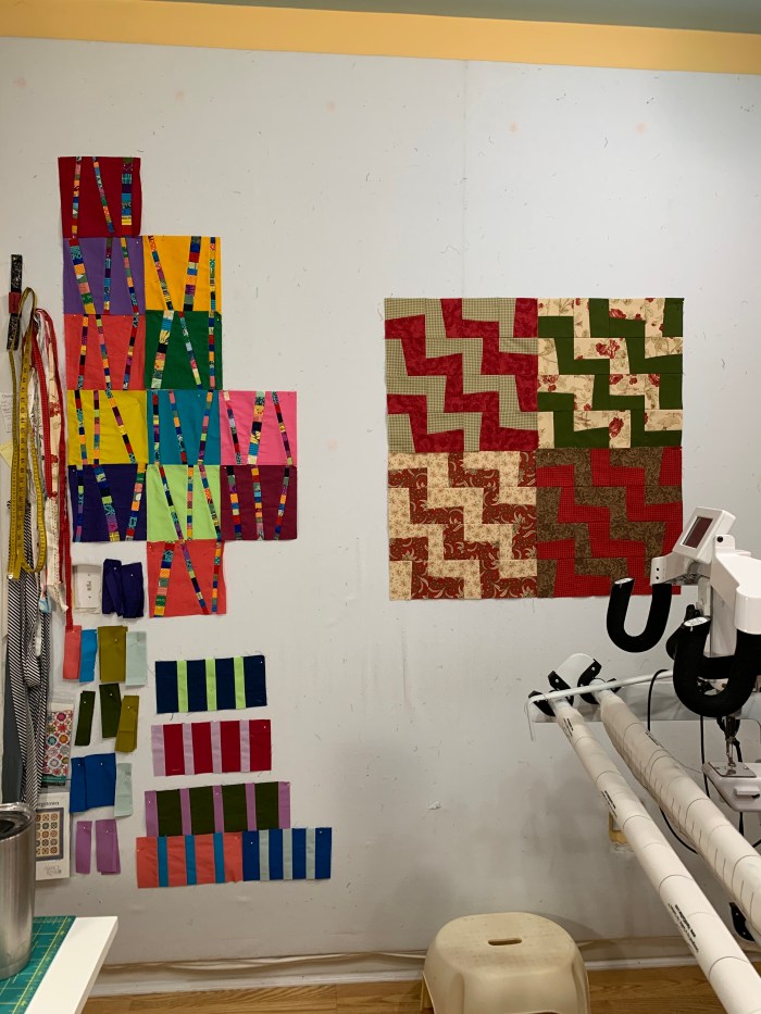 On the left are “kind of” leader/ender blocks taking shape—and both projects are meant to use up some of the solids I have acquired. I say “kind of” leader/ender projects as I also like to take some time just to play with these two projects.