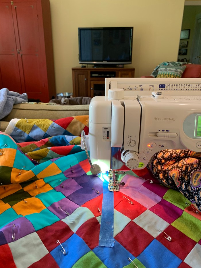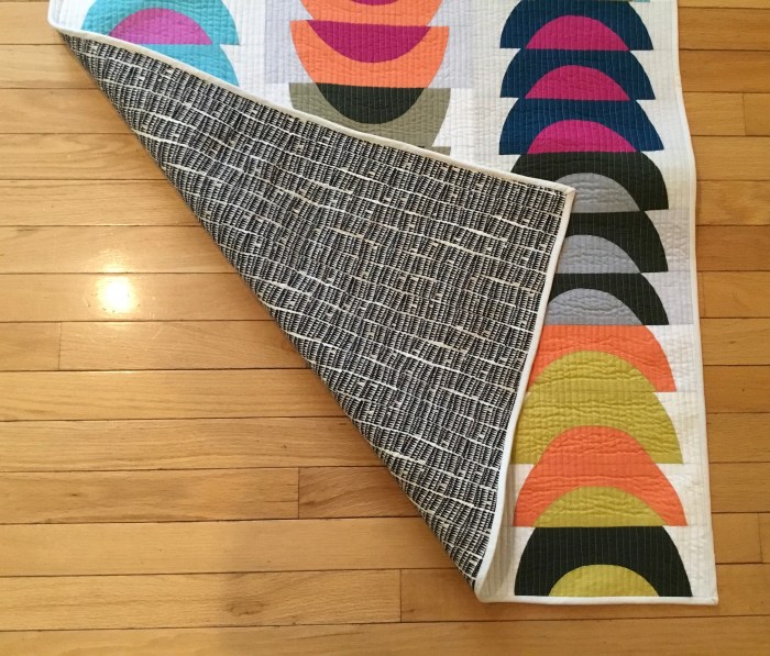 I also wasn’t sure what would work well as a backing, but I’m happy with this duller taupe colored fabric that has sprinkles of color that are, for the most part, also in the quilt. It’s Ruby Star Society, Speckles, and there is a very large range of colors in that line. This backing does not draw attention from the front of the quilt.