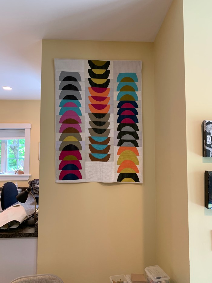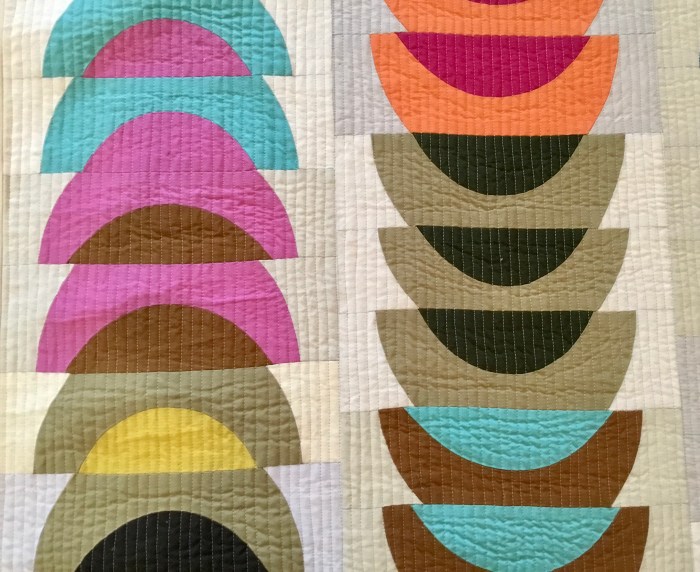 I wasn’t quite sure how to quilt it, but opted in the end for this overall design with curves and some sharp points. I like the texture that developed a lot. The pantograph is Checks and Chase by Lorien Quilting. The row is 8 inches and is double, so 16 inches wide.