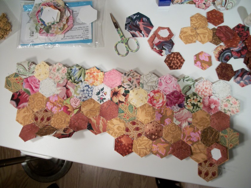I started it in Charleston, SC, Thanksgiving 2015 as my “take along” project. I used scraps from my 2 1/2 inch square bin. It felt more than a little daunting to take on a project this size with so many tiny (1-inch) pieces to make by hand using English Paper Piecing.
