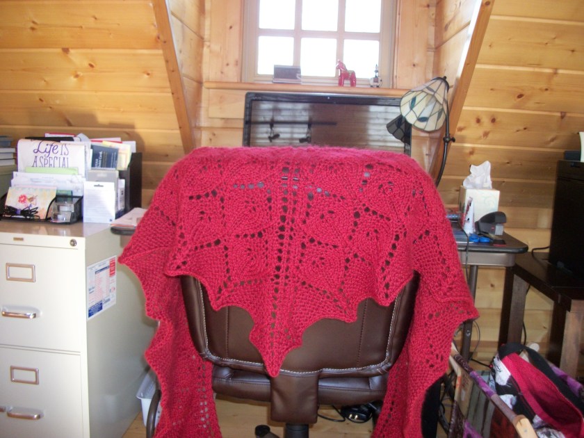 You can see a little in these pictures that what’s very nice about this shawl, other than the beautiful red color and the gorgeous pattern, is the large “u-shaped” neckline.  This shawl just “cozies” up to your body.
