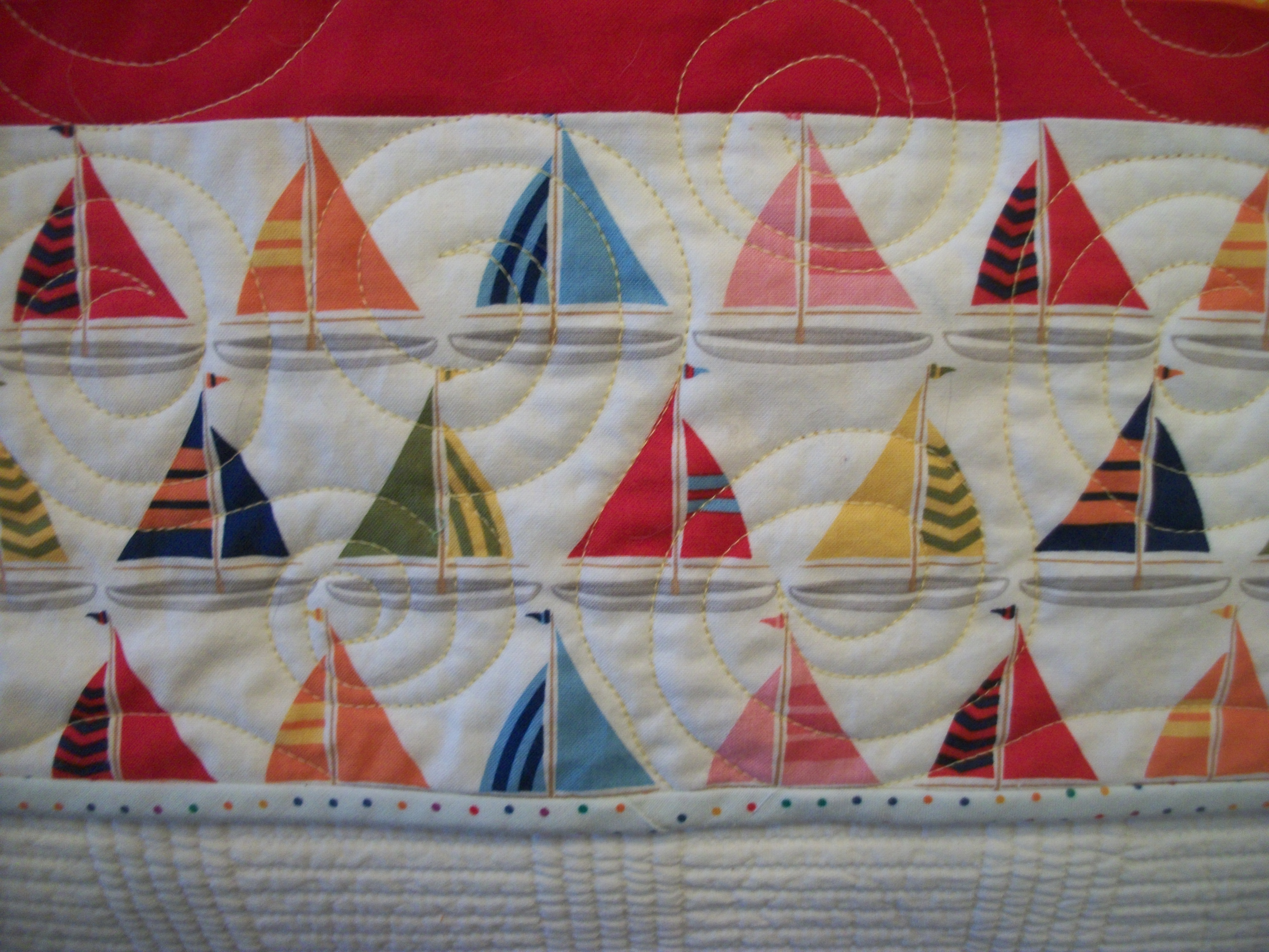 I had originally thought to use this muted blue stripe as the binding, but it found its way to the quilt’s back instead–interspersed with the sails fabric as I didn’t have enough of the blue.  Again, the yellow thread is working just fine on the back of the quilt.