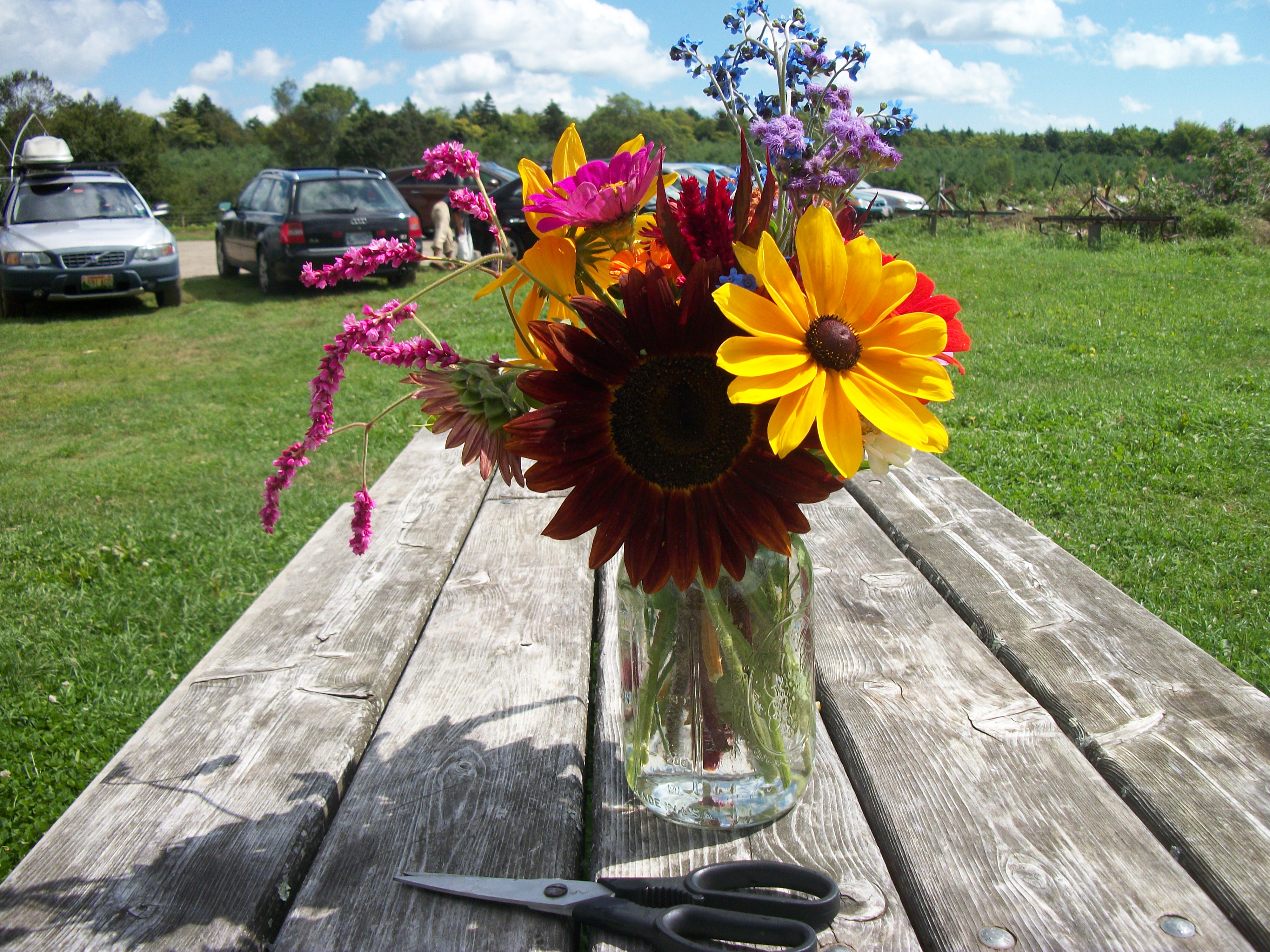 Today is Friday, and on Friday’s I got out to Hope’s Edge, our CSA (Community Shared Agriculture) farm,  to pick up our food.  I take a Mason jar and a pair of scissors along with me and cut a bouquet of flowers from the three long rows of flowers Farmer Tom plants for us each year.  I can fill the jar with water so the flowers don’t wilt hopelessly on the way home.