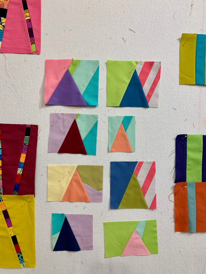 I’ve spent some time playing with using up the scraps in my solid scrap bin. I had a lot of leftover bias strips sewn together and cut from projects like The Color Collective Lone Star quilt process and the Sugaridoo QAL rows (the pink strips). What if I used them on fun and funky “tree triangles” that so many people are making these days as they rise to quilter Nicholas Ball’s challenge.