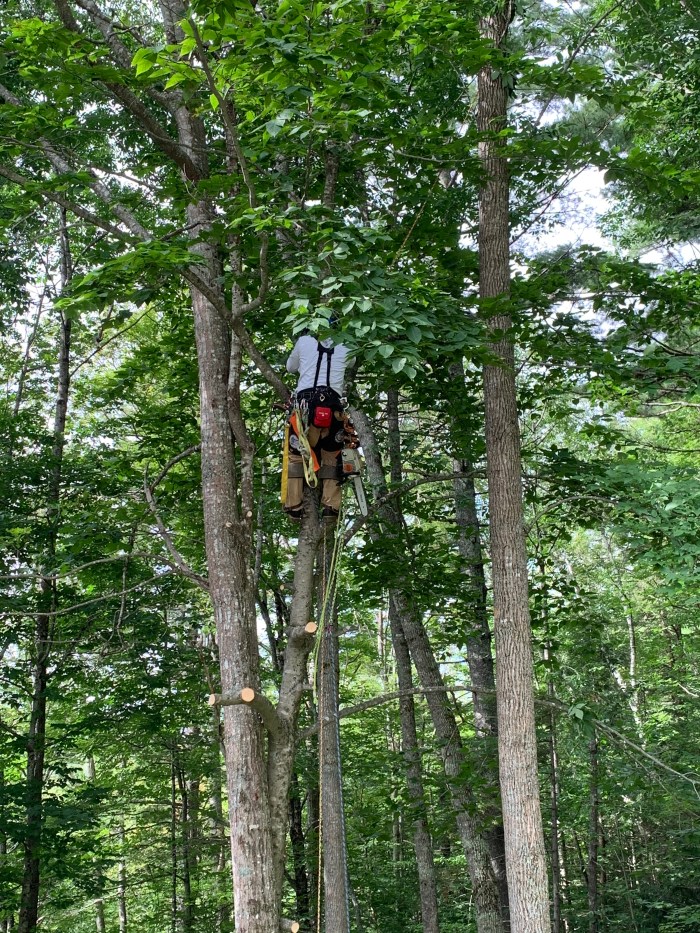 Timbercliff uses a bucket to get to the tops of the trees when they can.