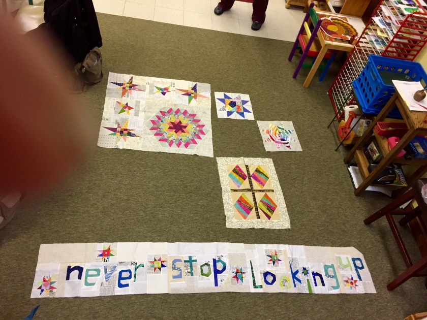 Becca Babb-Brott added the “never stop looking up” to Nancy Wright’s “star” quilt. And, the selvage star on the right. Joann more added the “made fabric” star in blues–a la Victoria Findlay Wolfe. I hope some of you have iPads and will look at these stars close up. I promise to get close ups next go round. This quilt is certain to get more celestial blocks.