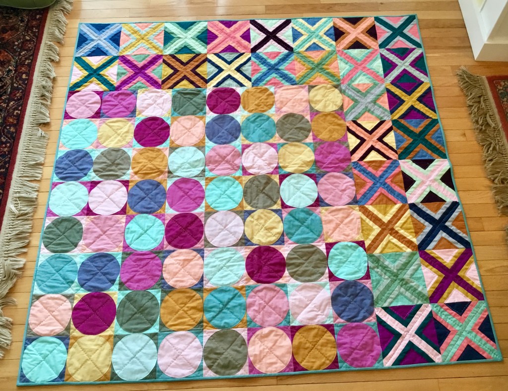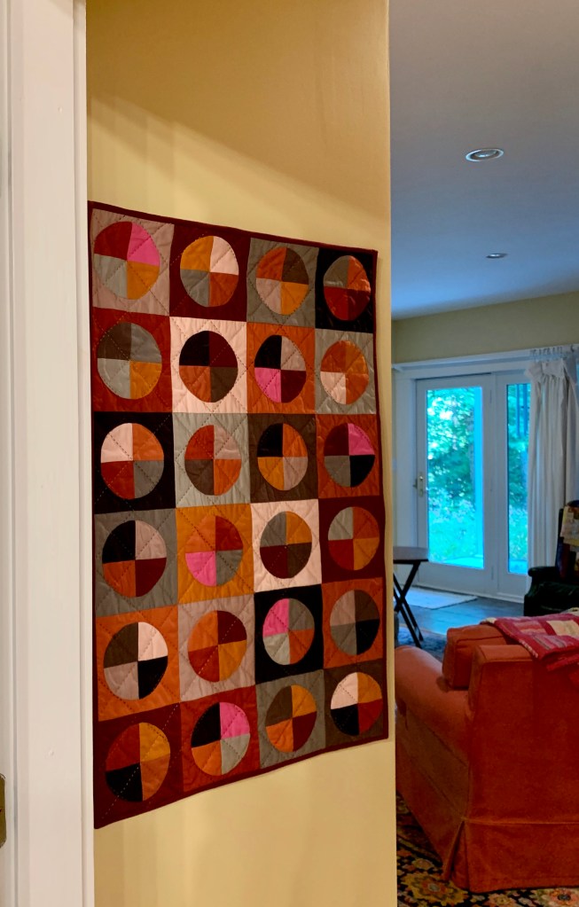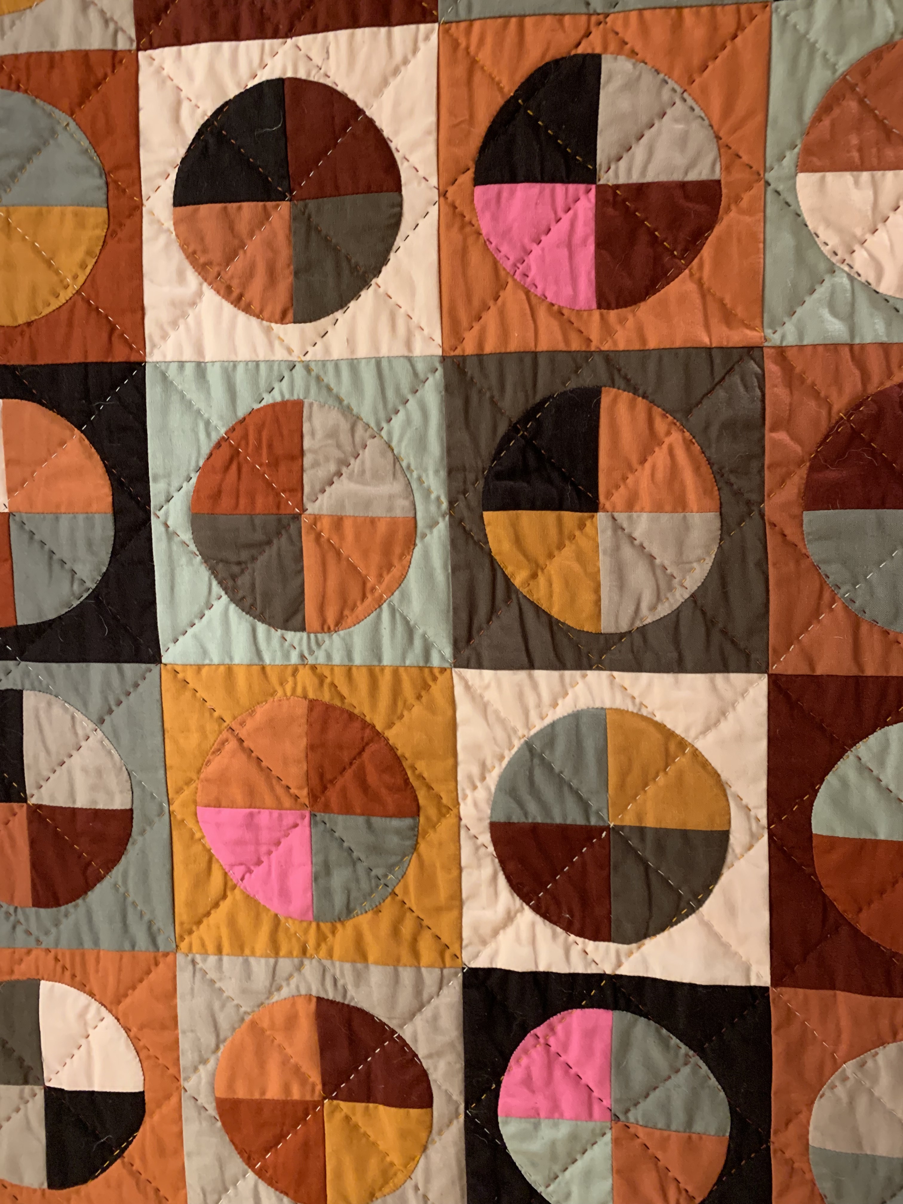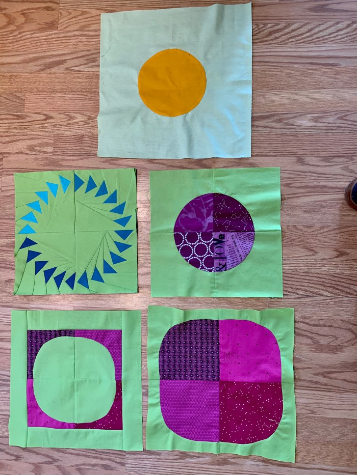 I pushed all the curved blocks together, whereas Latifah Saafir spread them out by including plain fabric blocks—which made for a beautiful, airy quilt. Maybe this could happen along with making blocks with a darker background for a small wall hanging or table runner of some sort.