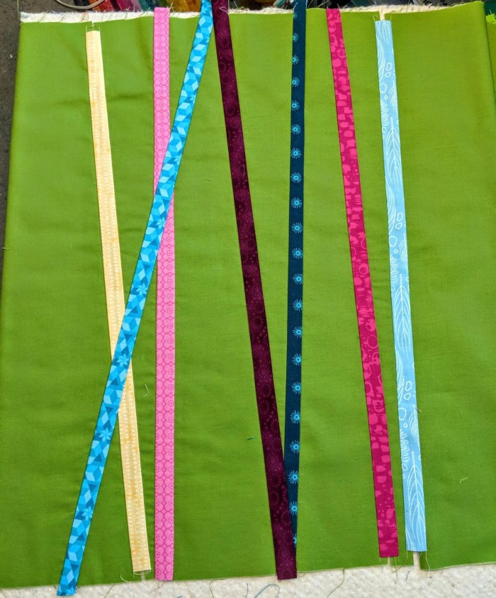 There was some drama while this top was still on the design wall: another chipmunk got into the house, the second one this year, and s/he appeared while I was watching nighttime tv and handsewing with AC doggie dead asleep next to me on the couch. When I shrieked, AC leapt up in a flash and trapped the chipmunk in the quilt room—where I shut the door to keep her/him in there. Unfortunately, when AC caught and shook the chipmunk, a spray of blood went across the bottom of the quilt.