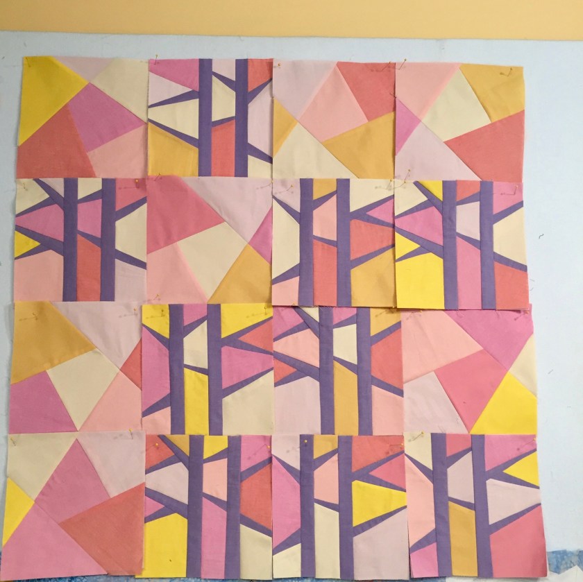 I actually really like this kind of play. The block on the left is made from 8 blocks leftover from some quilt or other. I cut them in half on the diagonal and recombined them into 4 blocks. I could put them together in many ways, but I think this way is visually interesting. Who knew? And that’s the fun of play.