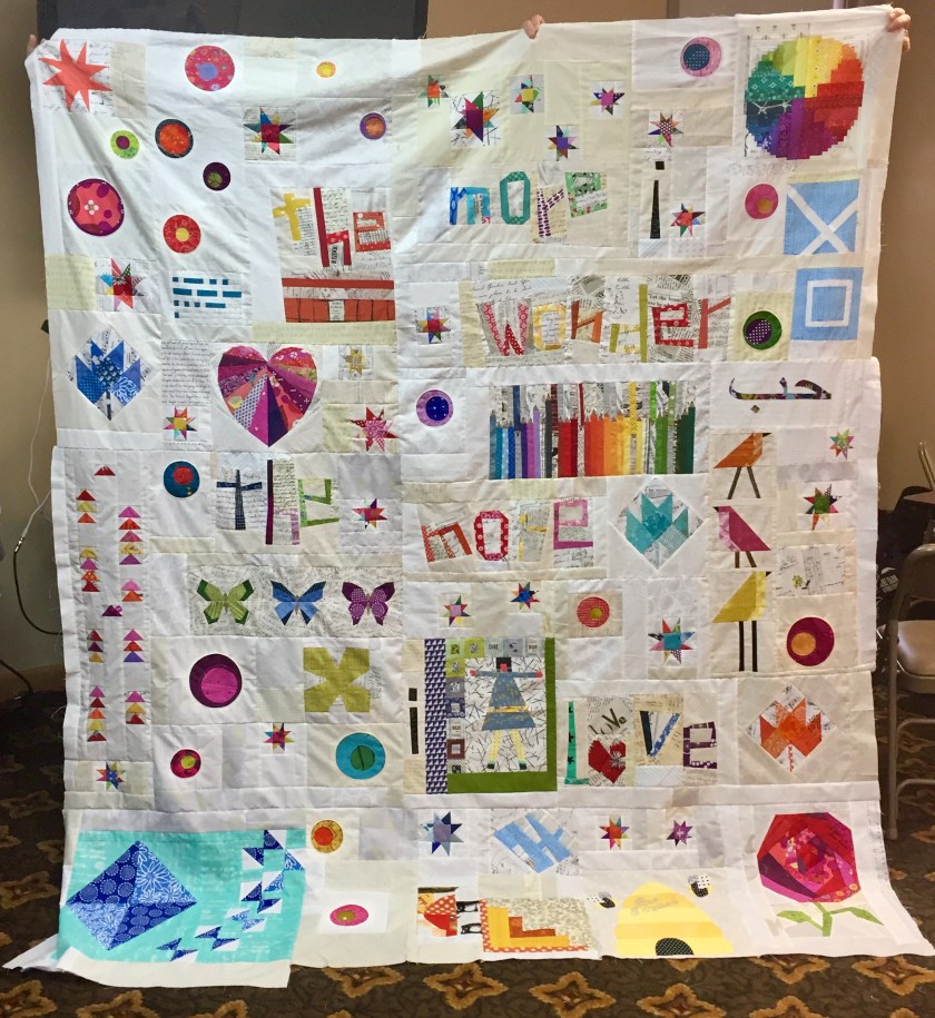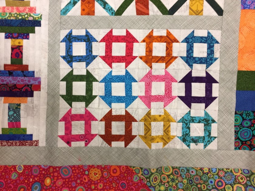 You may recall (see earlier posts) that these quilts began two summers ago when three of us (Linda, Becca Babb-Brott, and me) started just playing with blocks and making them for ourselves and each other—with the long-term goal of making improv quilts. The original idea for creating a bin of “parts department” blocks that are made and can be used in quilts came from books by Freddly Moran and Gwen Marston, who encouraged constructing “funky” blocks as part of the mix. Along the way we made Jen Kingwell’s improv quilt as part of a Mt. Battie Modern Quilt Guild challenge, and that helped us enormously in thinking how to piece together these “parts.”
