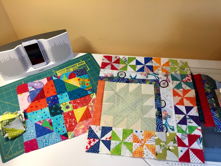 The pale green block in the middle on the right came from leftovers from a quilt. I took the two blocks I had, took off the solid part of the half-square triangle and sewed the two pieced parts together. And then sarted surrounding it with a set of pinwheel blocks. Something will go on the left side, but I, right now, have no idea what.