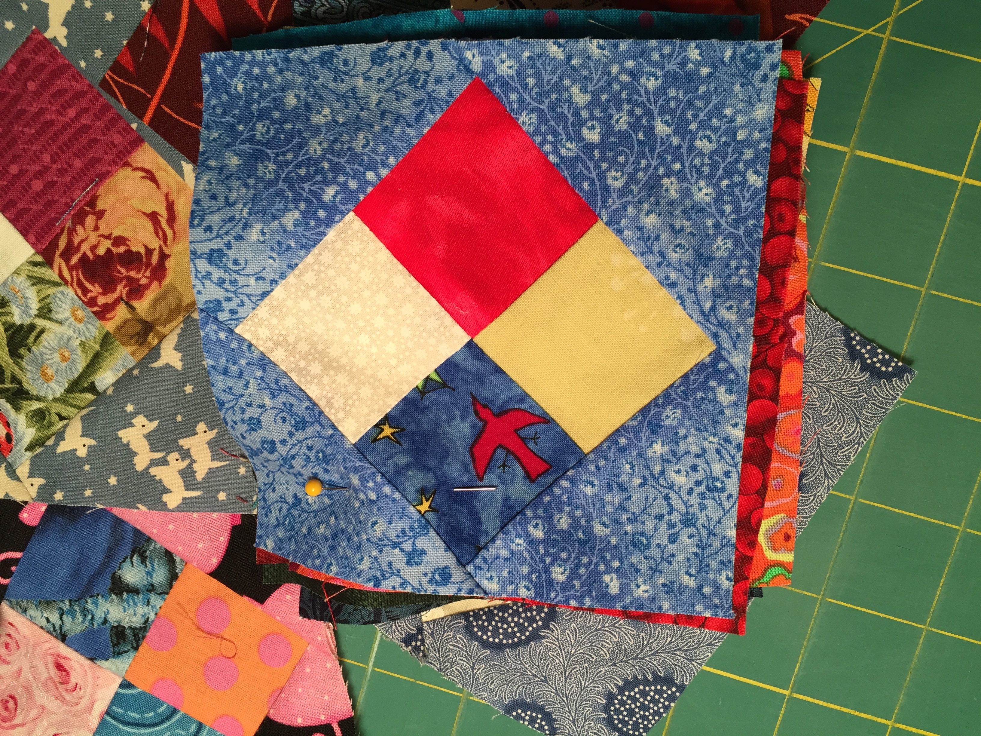 This year their challenge is to work with four patches–and the above quilt actually uses a lot of four patches. BUT, I am much more intrigued by the four-patches on point that Bonnie Hunter is making for her part in the magazine’s challenge. So, these patches have become my current leader/ender project.