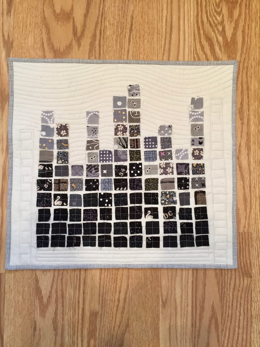 We were challenged in our new Mt. Battie Modern Quilt Guild to experiment with making a minimalist little quilt–the second “how to” chapter from the MIGHTY LUCKY QUILTING CLUB 2016 WORKBOOK, “Minimalist Improvisation,” by Season Evans. The plan of action in this chapter was very clear and very helpful. Here’s what I devised: