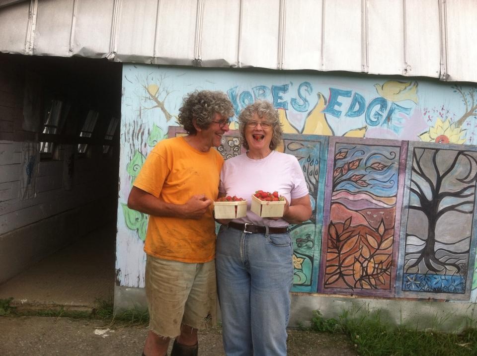 Hope’s Edge, my CSA, is in full swing.  Last week was the first strawberry week.  Here’s Farmer Tom laughing as I sample one of the strawberries I picked.