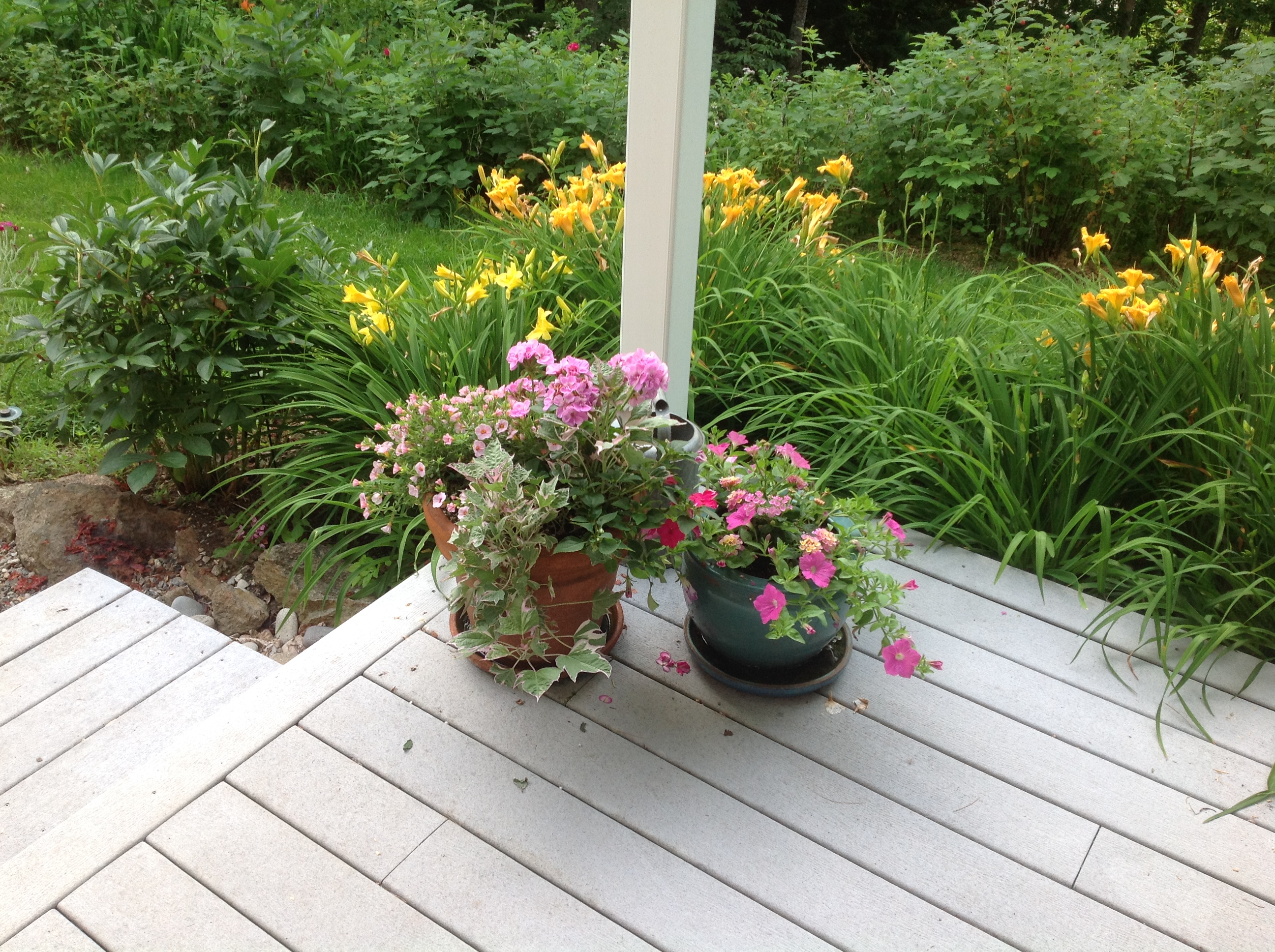 On the front porch, the Lantana in the pot on the right is gearing up.  I really like the pink-tinged ivy in the big pot too.  The raspberries in the background are just starting to produce fruit.