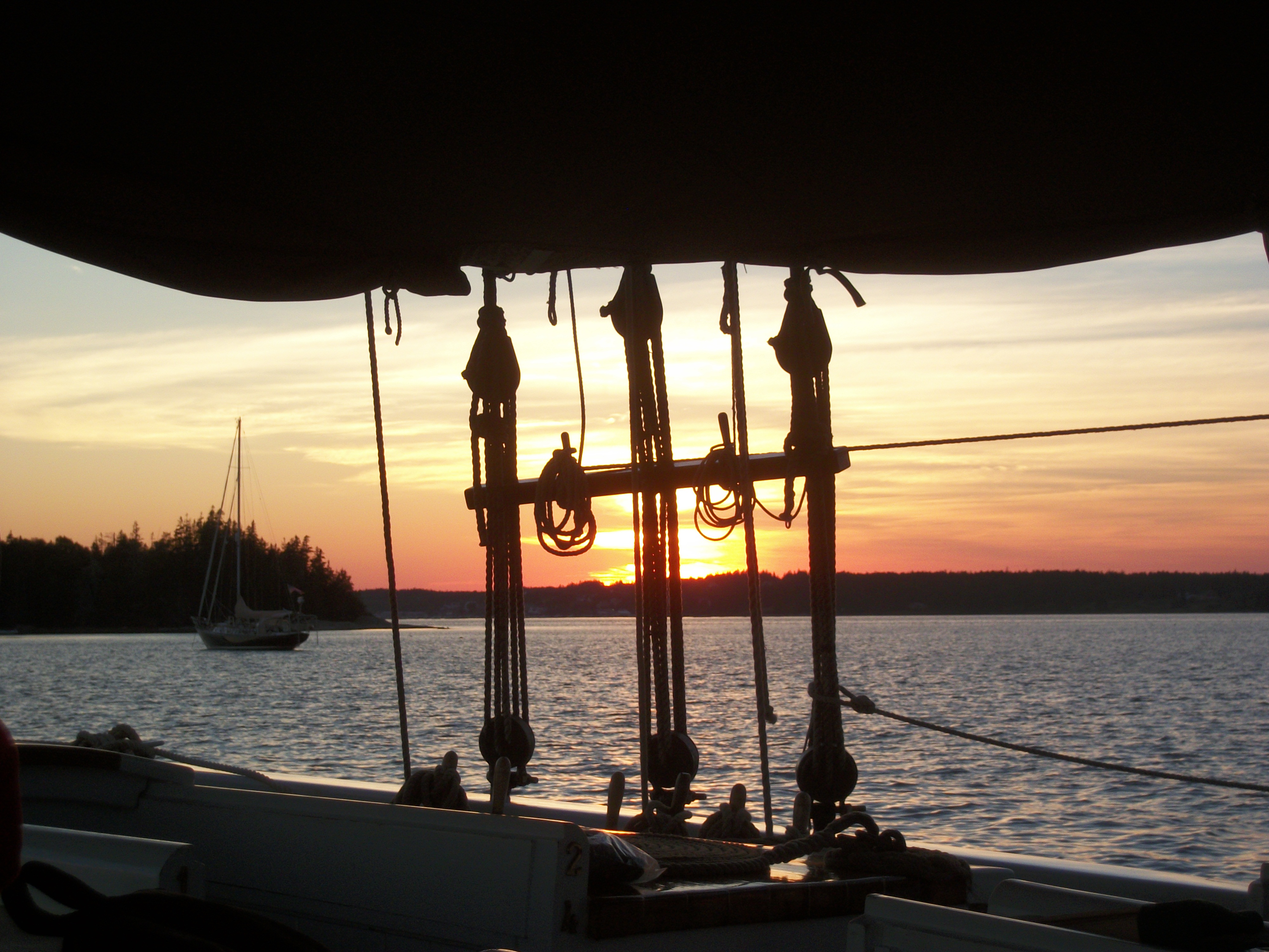 I have some other short videos (the lobster bake, the last night, raising the front sail, hauling the anchor), which I will post separately, but I will end with this picture of a sunset on the Bay: