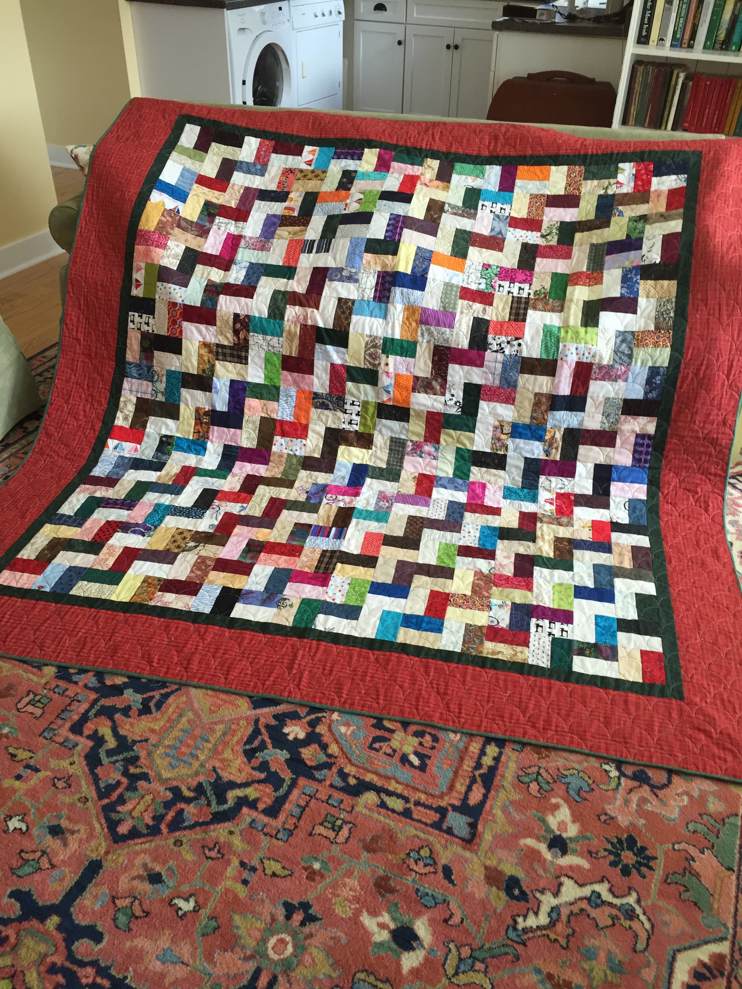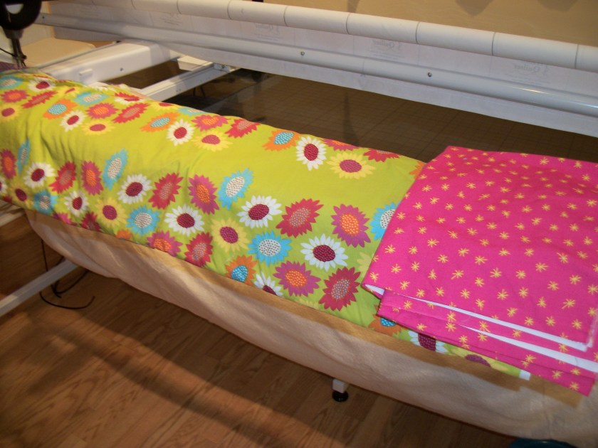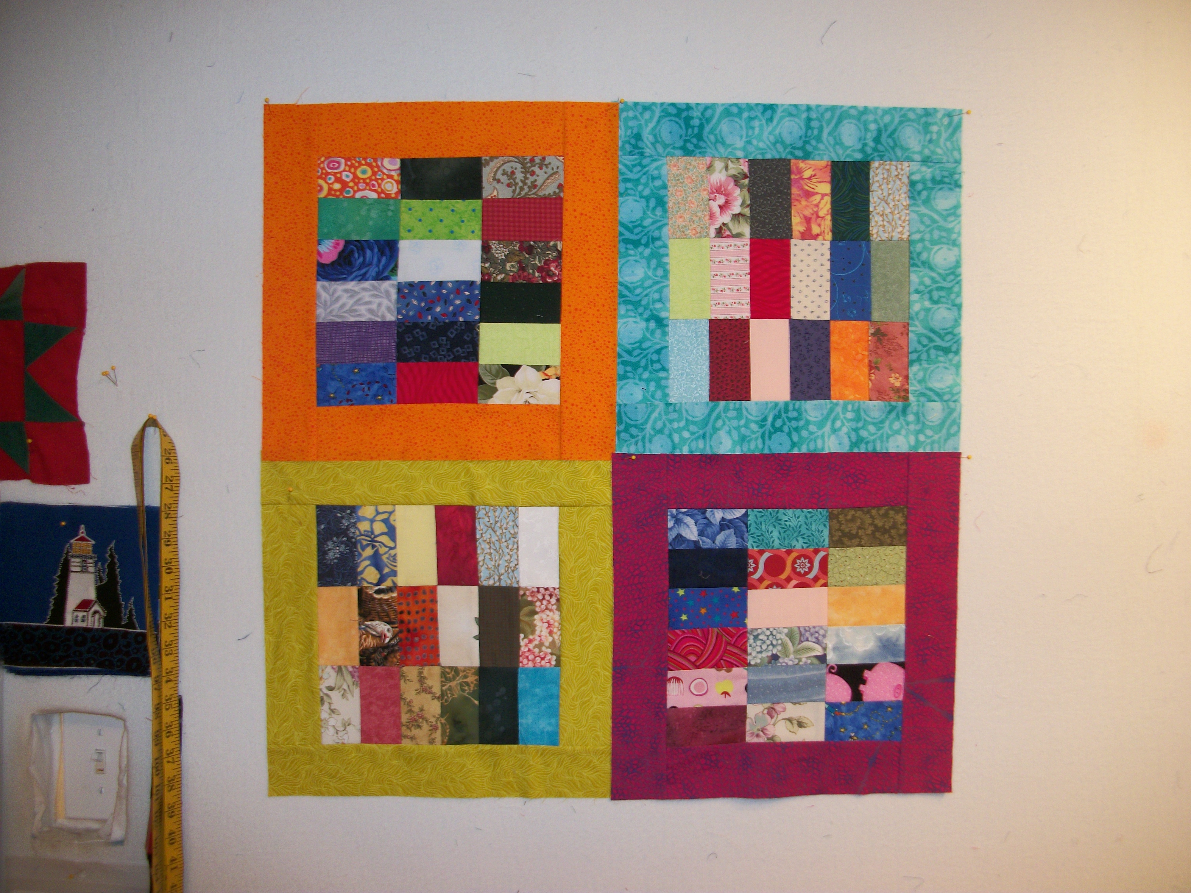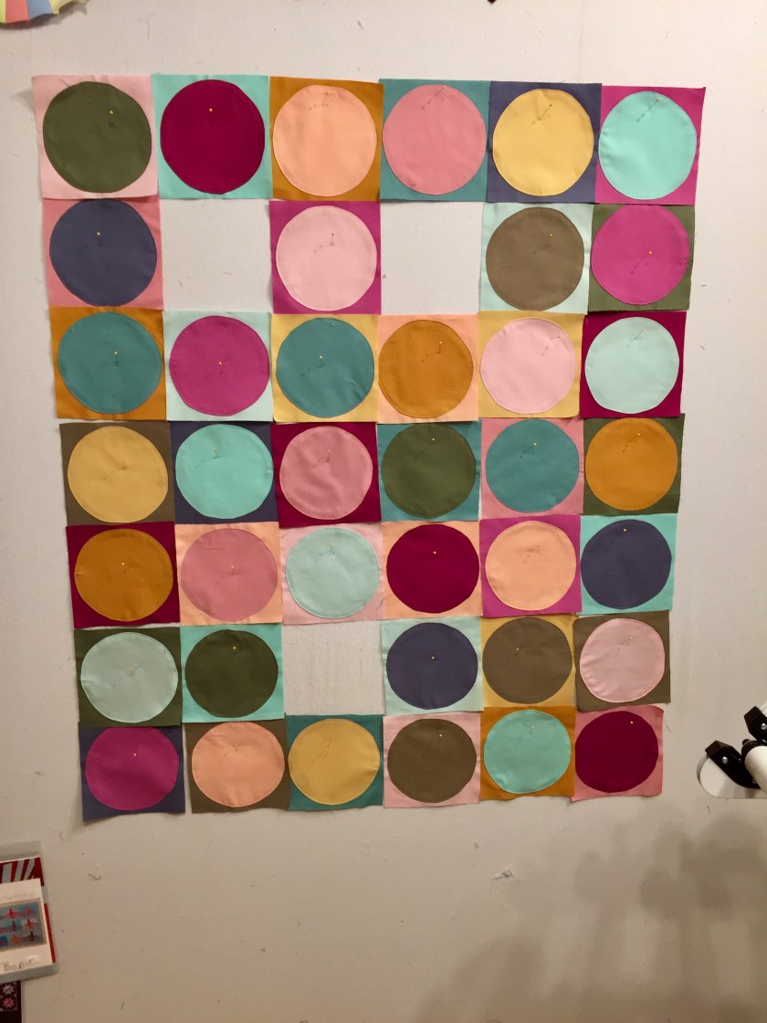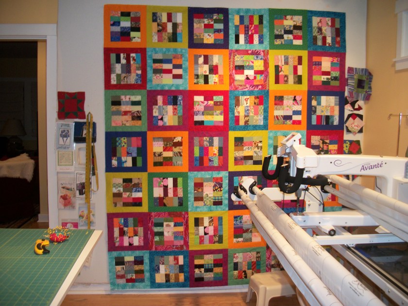 I’ll be layering and pinning the solid scrappy trip/granny quilt from Then Came June (Checkered Garden) today. I want to diagonal grid quilt it on a domestic, but will pin it on the longarm. I loved Then Came June’s version and thought it would be a good use for the solid scraps I have. It’s bright and wild. And maybe that’s it’s name?
