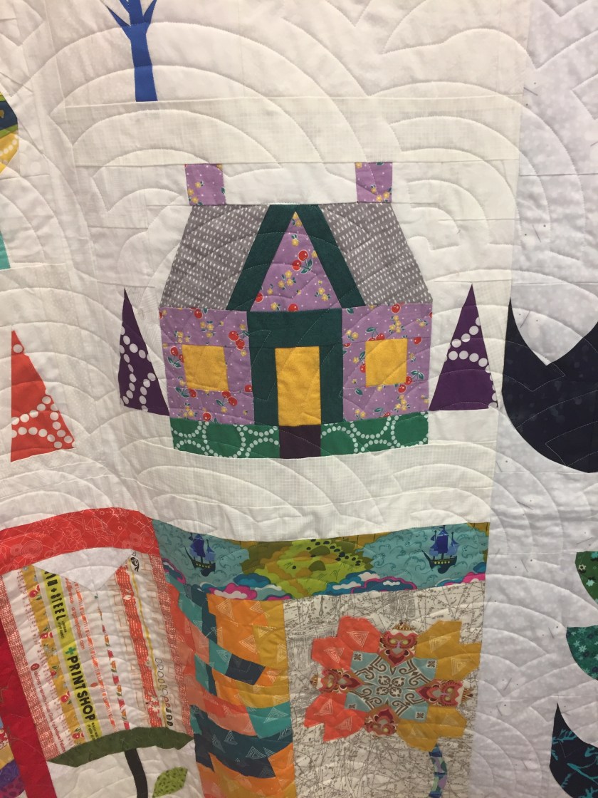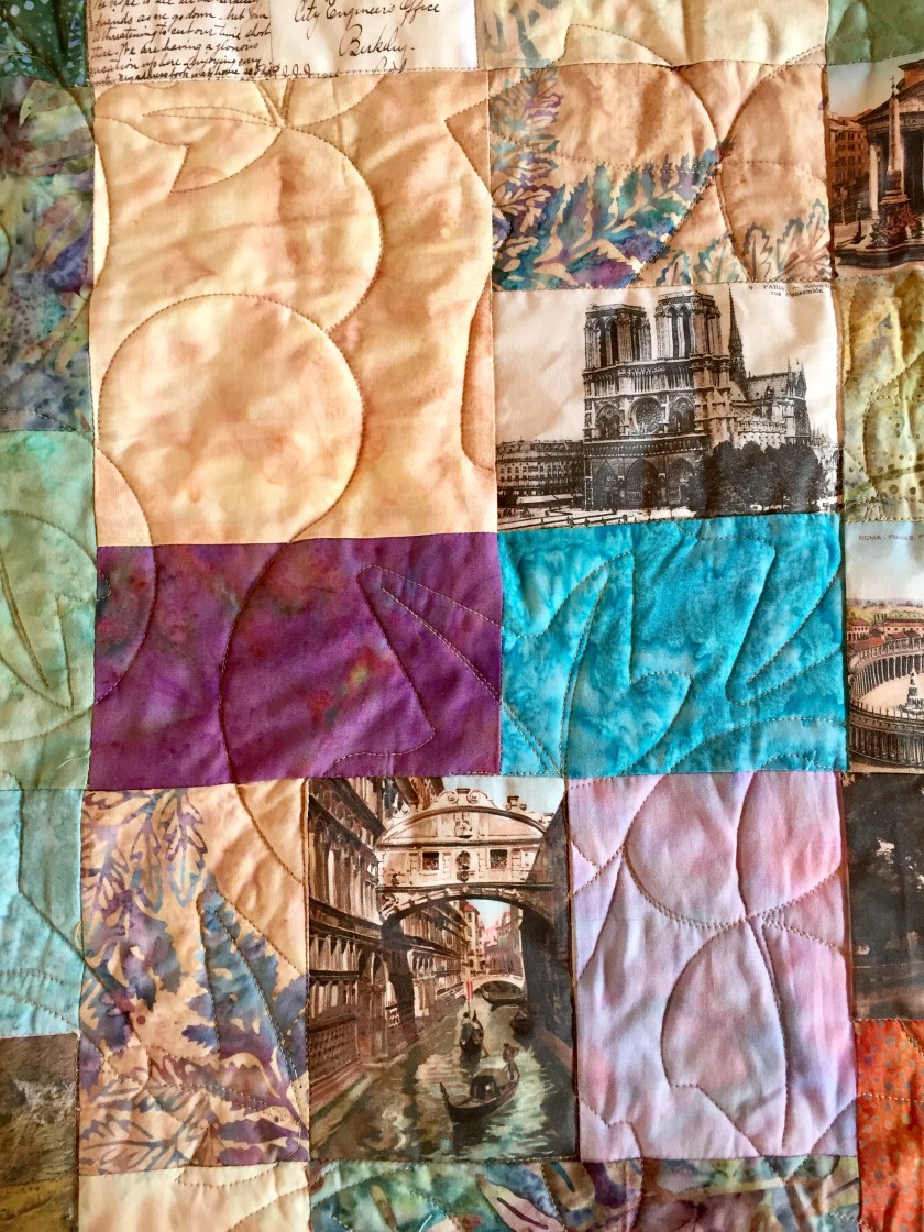 The Galactic wall hanging top is finished, layered, pinned, and waiting for obtaining some Wonderfil GlaMour thread—a rayon with a metallic strand—that designer Tara Faughnan used and loved. Marge Hallowell at Mainely Sewing is going to carry this thread. I am hoping she can mail me some. I LOVE this quilt and this pattern. Tara Faughnan designed it and curated the fabrics in THE COLOR COLLECTIVE online class by Amy Newbold’s Sewtopia.