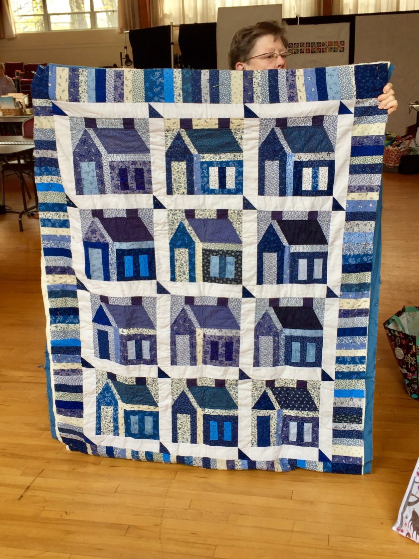Here is Gumdrops—another Tara Faughnan project from The Color Collective. The blocks are English Paper Pieced, and we learned how to use a cardstock that one’s printer would take to make the six different patterns. I’m making a wall hanging with this one too—probably about 30 wide by 30-40 long, with three staggered rows. I will, of course, move blocks around a whole lot more as each combo gets finished. I hand sew at night while watching tv.