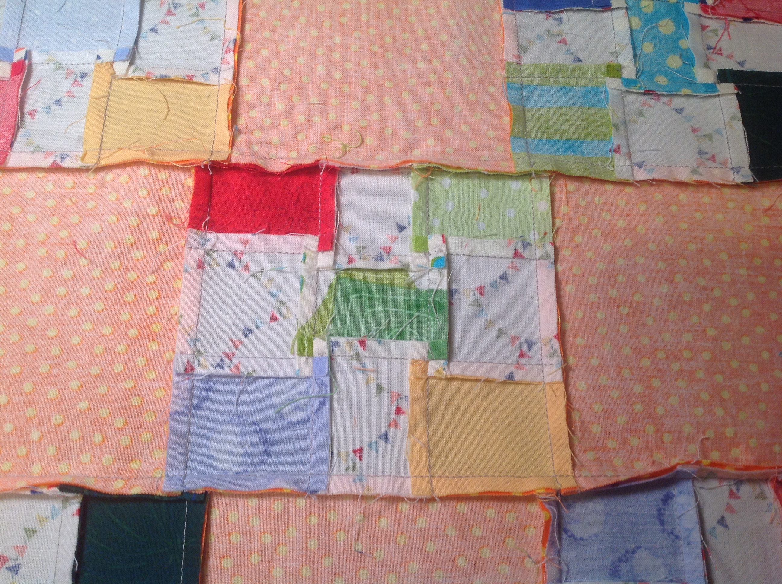 I am sewing together colorful 5-inch blocks from my stash.  I will put a 3-inch border on this grid and use it to cut out “Lil Twister” blocks.  Here’s a clue of what I am talking about:
