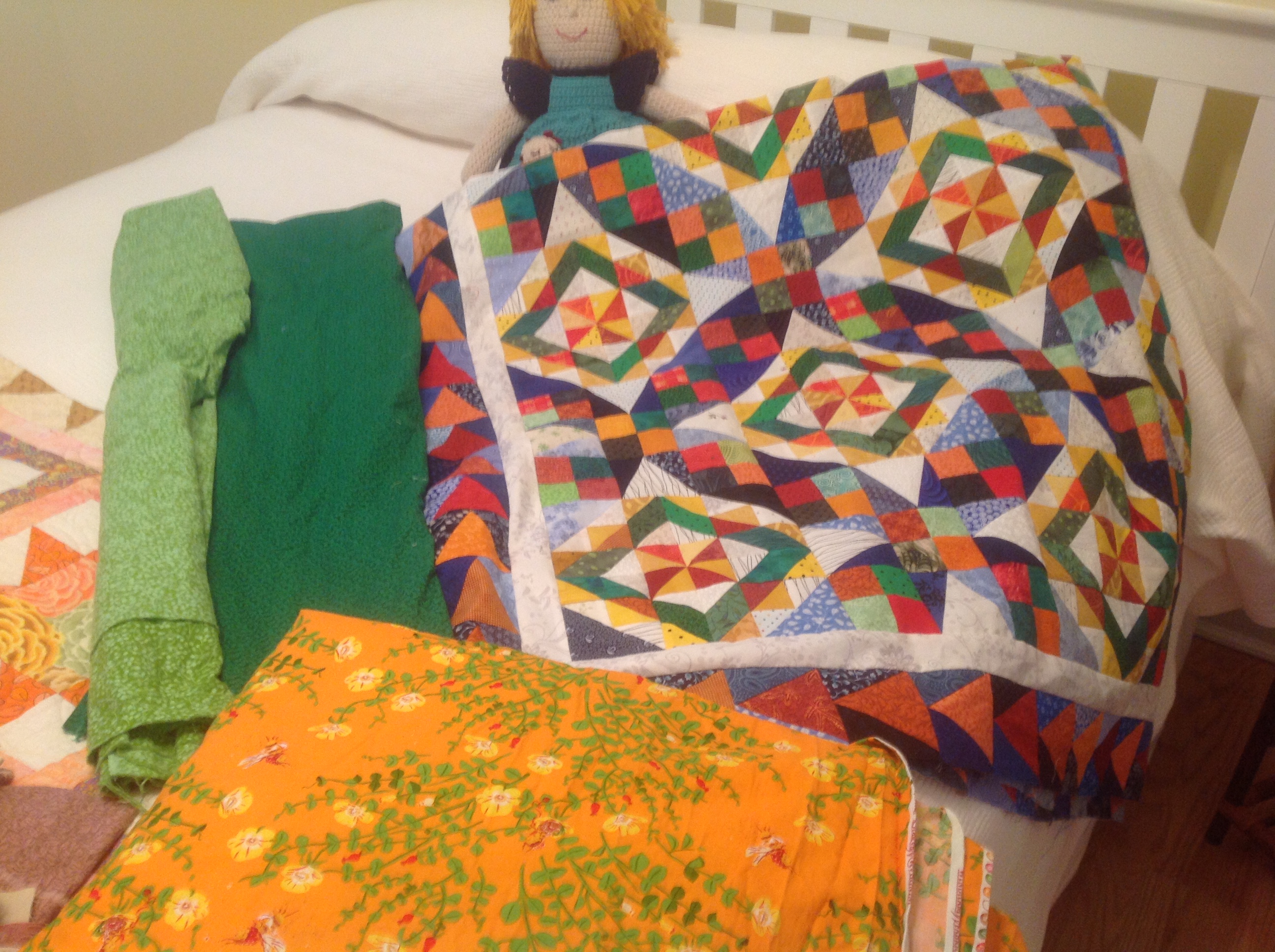 Celtic Solstice:  I put on the white border yesterday.  And got one triangle border on when I realized that I had TWO blocks with the orange going the wrong way.  Mercy!  I took the rows apart and turned the blocks, and the job was easier than I had expected.  When I finish here, I’m going to make a cup of tea and put on the other three borders.  Tomorrow I’m going to a big quilt fabric sale to get some green or blue to finish this amazing quilt.  And, the backing and binding.  There are so many seams that I do not want to piece blocks for the back.  It will be so hard to quilt if I do.