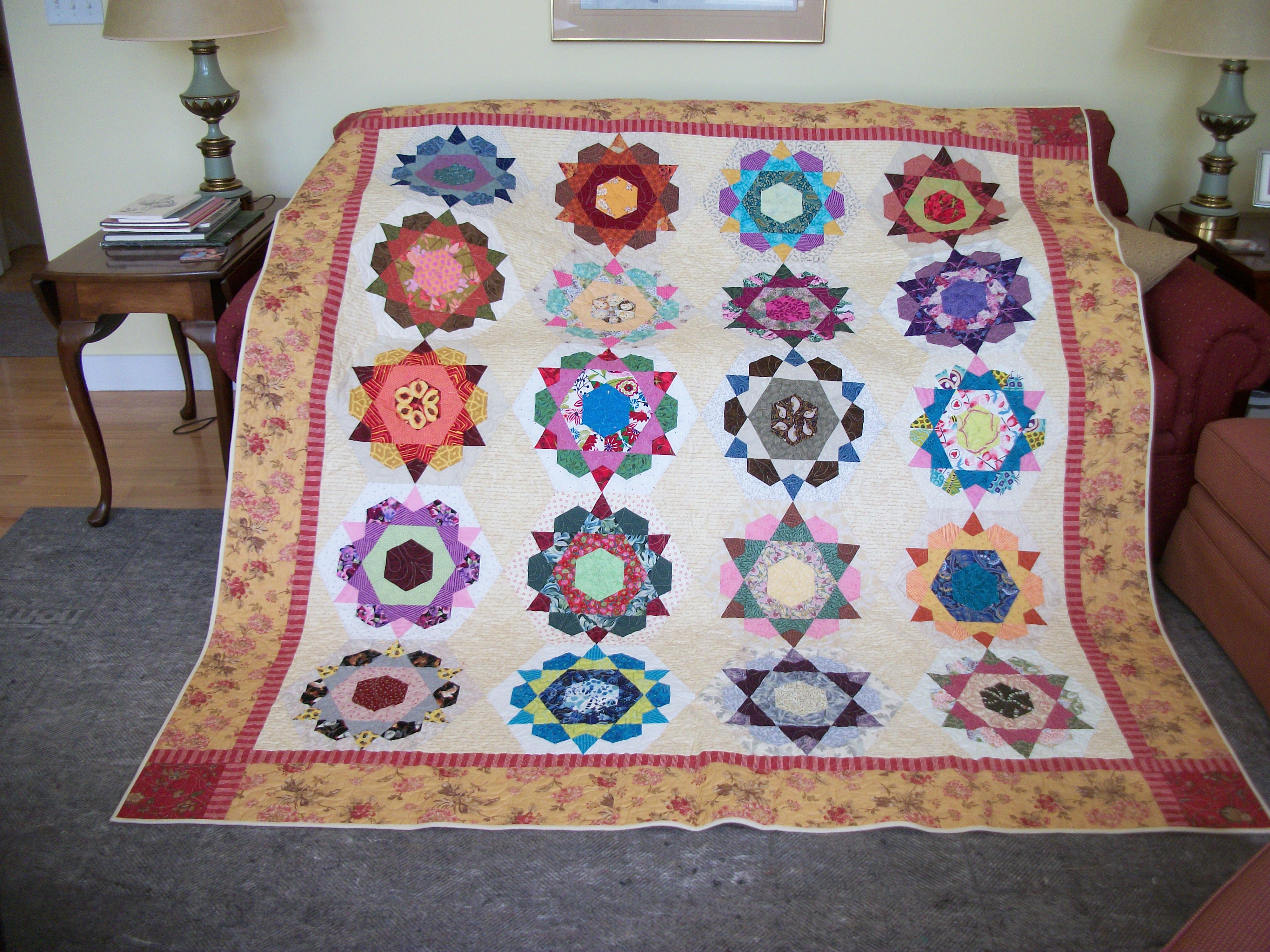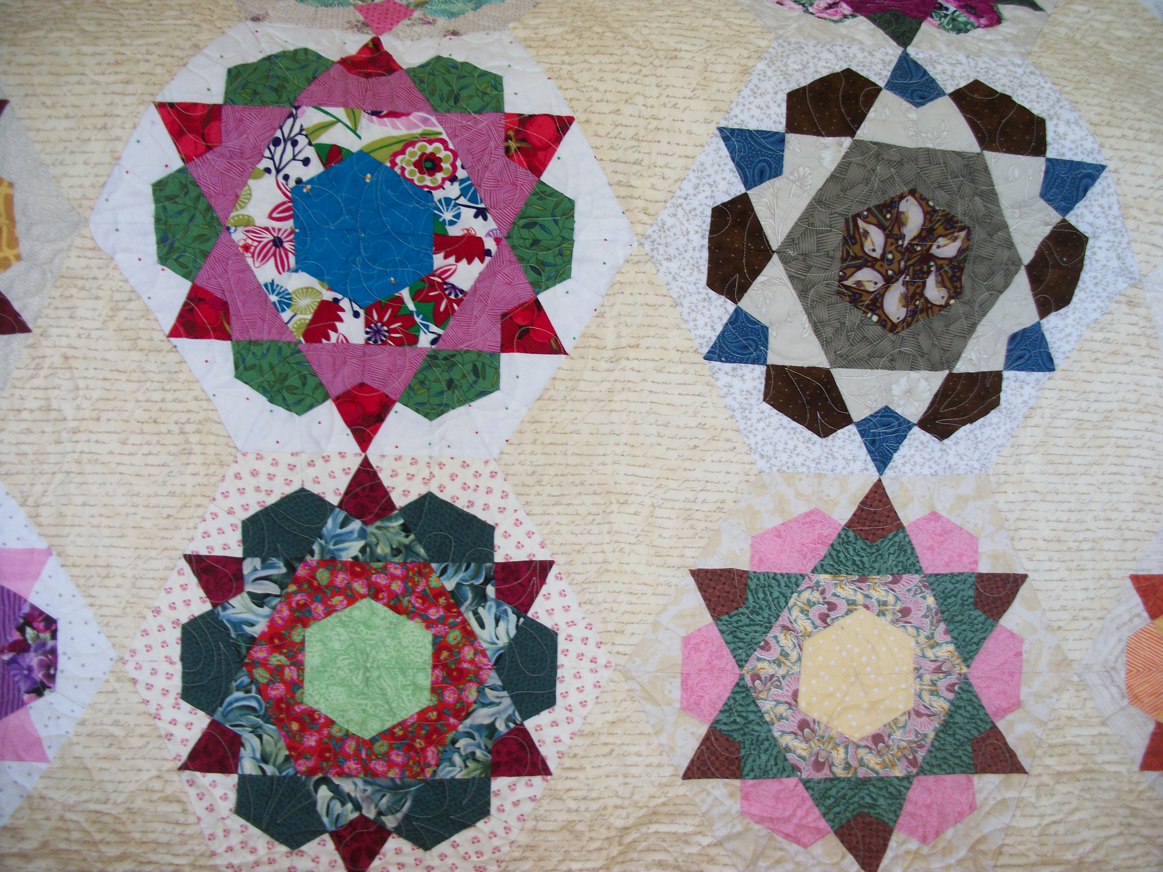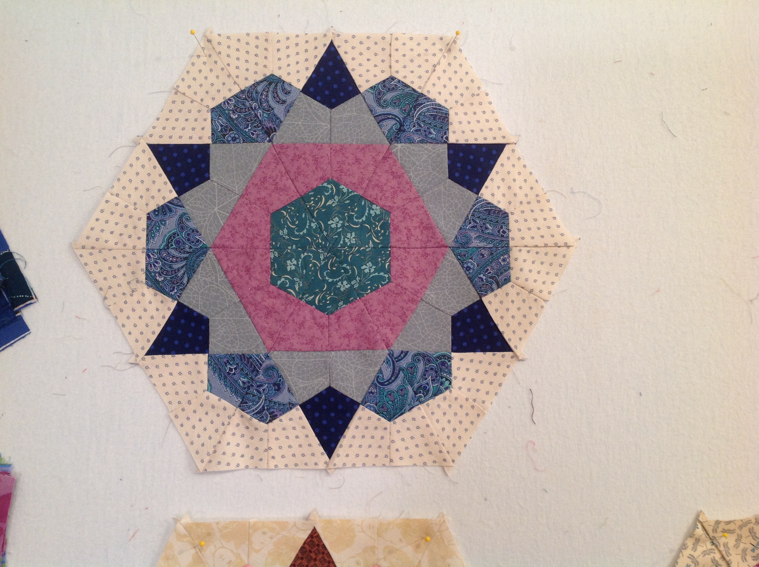 This large “hexie” is made from the kite shape you can see with the dark blue.  I first saw a quilt made with these medallions at Alewives, a quilt shop in Damariscotta Mills, Maine.  The hexies get linked by big diamonds, and the pattern comes from the book Material Obsession 2 by Kathy Doughty and Sarah Fielke.  Other blog entries here show their TWO quilt versions using this block.  Rhea Butler made the quilt at Alewives.